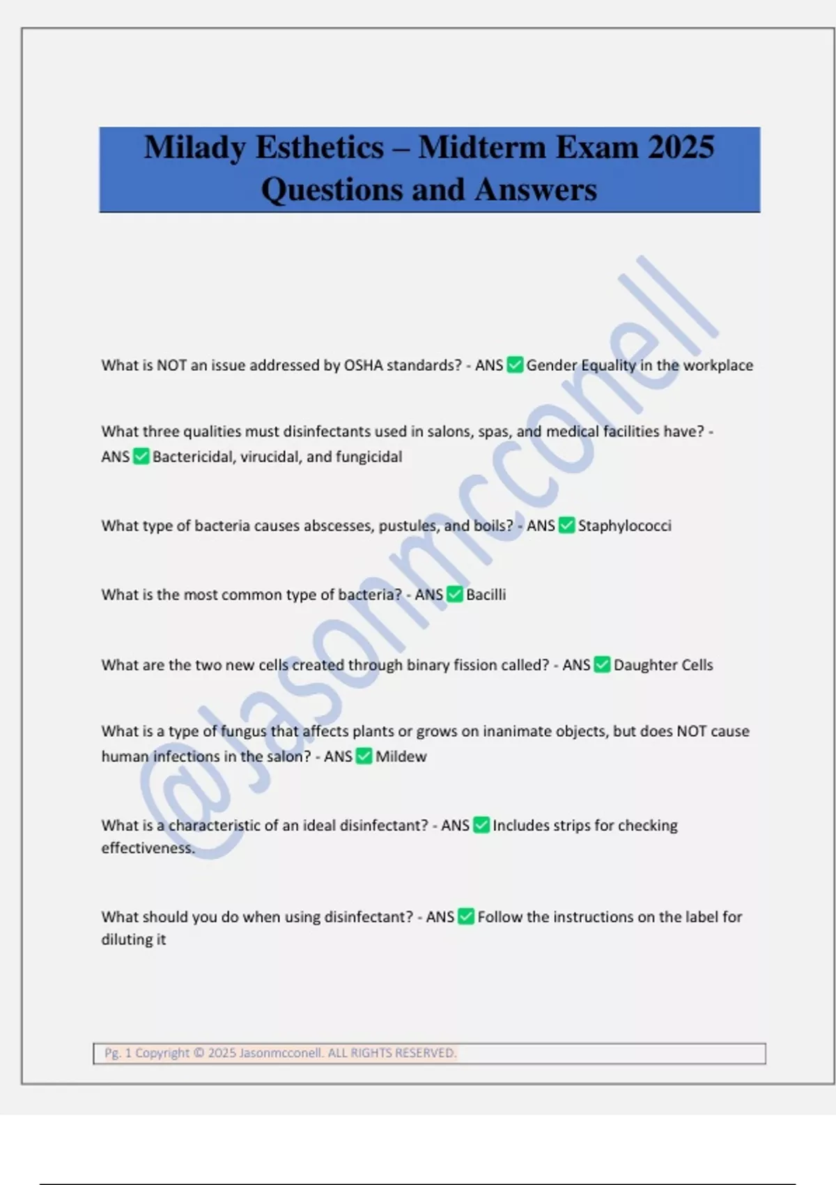 Milady Esthetics – Midterm Exam 2025 Questions and Answers What is NOT an issue addressed by OSHA standards? - ANS Gender Equality in the workplace What three qualities must disinfectants used in salons, spas, and medical facilities have? - ANS Bactericidal, virucidal, and fungicidal What type of bacteria causes abscesses, pustules, and boils? - ANS Staphylococci What is the most common type of bacteria? - ANS Bacilli What are the two new cells created through binary fission called? - ANS Daughter Cells What is a type of fungus that affects plants or grows on inanimate objects, but does NOT cause human infections in the salon? - ANS Mildew What is a characteristic of an ideal disinfectant? - ANS Includes strips for checking effectiveness. What should you do when using disinfectant? - ANS Follow the instructions on the label for diluting it Pg. 2 Copyright © 2025 Jasonmcconell. ALL RIGHTS RESERVED. What statement about phenolic disinfectants is true? - ANS They are a form of formaldehyde When should you wash your hands? - ANS Before and after a service What should you do to help keep the workplace healthy and look its best? - ANS Clean fans and humidifies at least once a week What do Human cells need to grow and reproduce? - ANS Ability to eliminate waste what type of tissue gives smoothness and contour to the body? - ANS adipose What type of tissue is composed of neurons? - ANS Nerve What is NOT a function of skeletal system? - ANS Contracting and moving parts of he body What are the two basic types of joints? - ANS movable and immovable What bone is also known as the collarbone? - ANS Clavicle What muscle extends along the side of the neck from the ear to the collarbone? - ANS sternocleidomastoid What makes up the bulk of the brain? - ANS Cerebrum What is the largest of the cranial nerves? - ANS Fifth What nerve affects the side of t