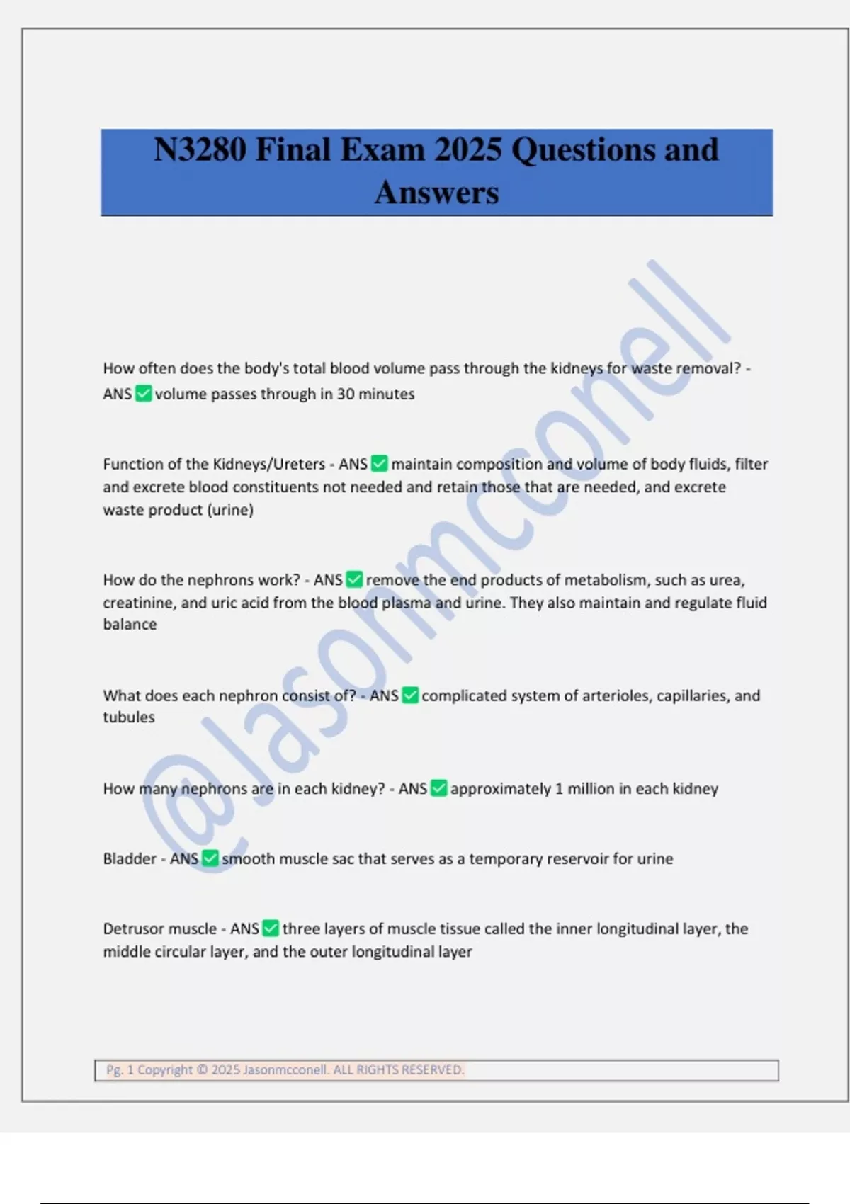 N3280 Final Exam 2025 Questions and Answers How often does the body's total blood volume pass through the kidneys for waste removal? - ANS volume passes through in 30 minutes Function of the Kidneys/Ureters - ANS maintain composition and volume of body fluids, filter and excrete blood constituents not needed and retain those that are needed, and excrete waste product (urine) How do the nephrons work? - ANS remove the end products of metabolism, such as urea, creatinine, and uric acid from the blood plasma and urine. They also maintain and regulate fluid balance What does each nephron consist of? - ANS complicated system of arterioles, capillaries, and tubules How many nephrons are in each kidney? - ANS approximately 1 million in each kidney Bladder - ANS smooth muscle sac that serves as a temporary reservoir for urine Detrusor muscle - ANS three layers of muscle tissue called the inner longitudinal layer, the middle circular layer, and the outer longitudinal layer Pg. 2 Copyright © 2025 Jasonmcconell. ALL RIGHTS RESERVED. Function of the sphincter - ANS guards opening between urinary bladder and urethra Function of the urethra - ANS convey urine from the bladder to exterior of body Where is the prostate gland located? - ANS located below the urethra of a male True or false: No portion of the female urethra is external to the body? - ANS true. there is no portion exposed What are the parts of a male urethra? - ANS prostatic, membranous, and cavernous portions It is approximately 5 1/2 to 6 1/4 inches long Act of urination (micturation) - ANS the process of emptying the bladder Where are the nerve centers for urination situated? - ANS the nerve centers for this are located in the brain and spinal cord Process of emptying the bladder - ANS detrusor muscle contracts internal sphincter relaxes urine enters posterior urethra muscles of perineum and external sphincter relax muscles of abdominal wall contracts slightly diaphragm lowers, micturation occurs Autonomic bladder - ANS bladder no longer controlled by the brain due to injury or disease Urinary incontinence - ANS any involuntary loss of urine Pg. 3 Copyright © 2025 Jasonmcconell. ALL RIGHTS RESERVED. Dysuria - ANS painful or difficult urination Frequency - ANS increased incidence of voiding nocturia - ANS awakening at night to urinate anuria - ANS 24 hour urine output is less than 50 mL oliguria - ANS 24 hour urine output is less than 400 mL polyuria - ANS excessive urination proteinuria - ANS protein in the urine Hematuria - ANS blood in the urine glycosuria - ANS glucose in the urine pyuria - ANS pus in the urine Urgency - ANS strong desire to void urine urinary incontinence - ANS involuntary loss of urine nocturia - ANS voiding