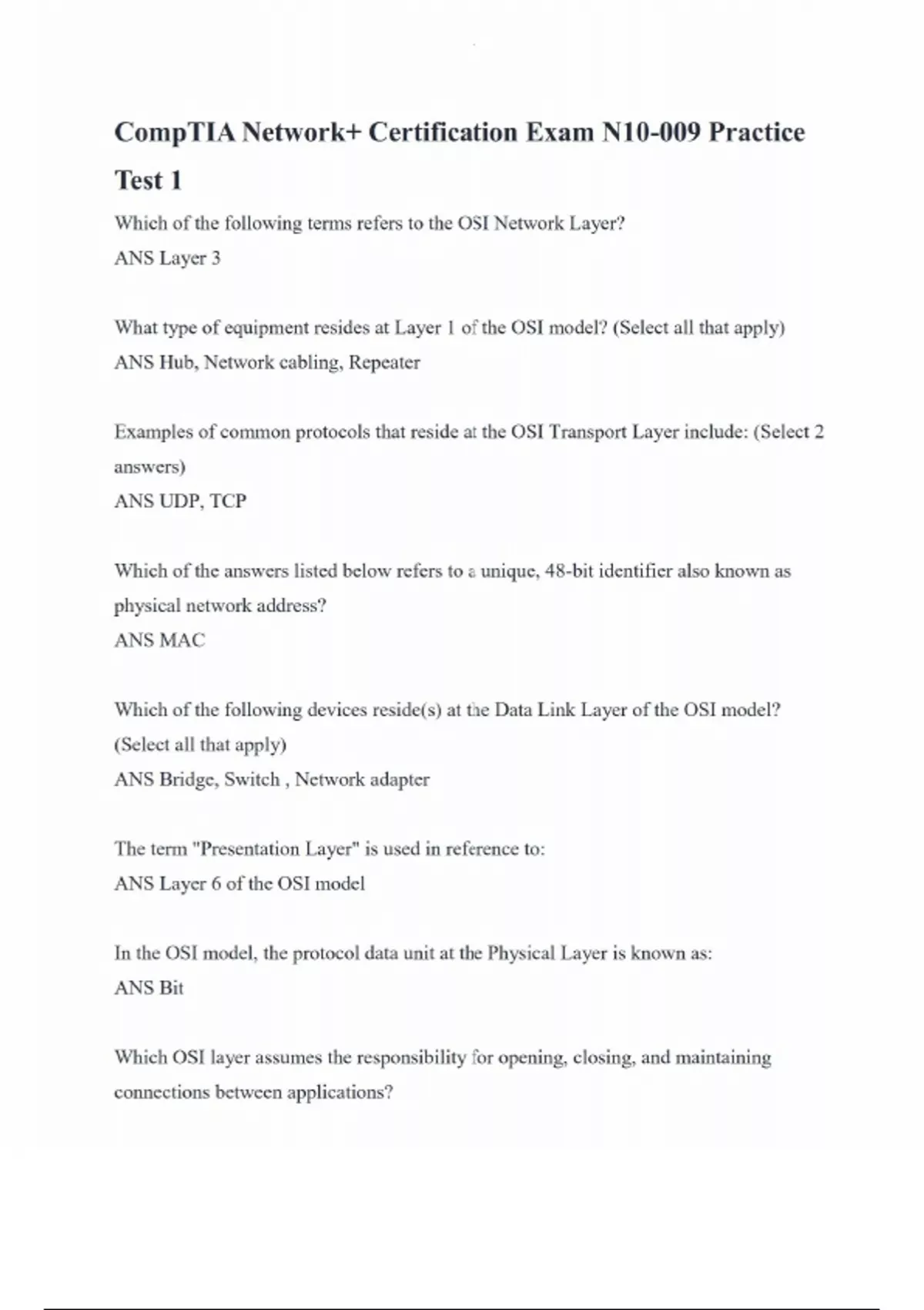 CompTIA Network+ Certification Exam N10-009 Practice Test 1 Which of the following terms refers to the OSI Network Layer? ANS Layer 3 What type of equipment resides at Layer 1 of the OSI model? (Select all that apply) ANS Hub, Network cabling, Repeater Examples of common protocols that reside at the OSI Transport Layer include: (Select 2 answers) ANS UDP, TCP Which of the answers listed below refers to a unique, 48-bit identifier also known as physical network address? ANS MAC