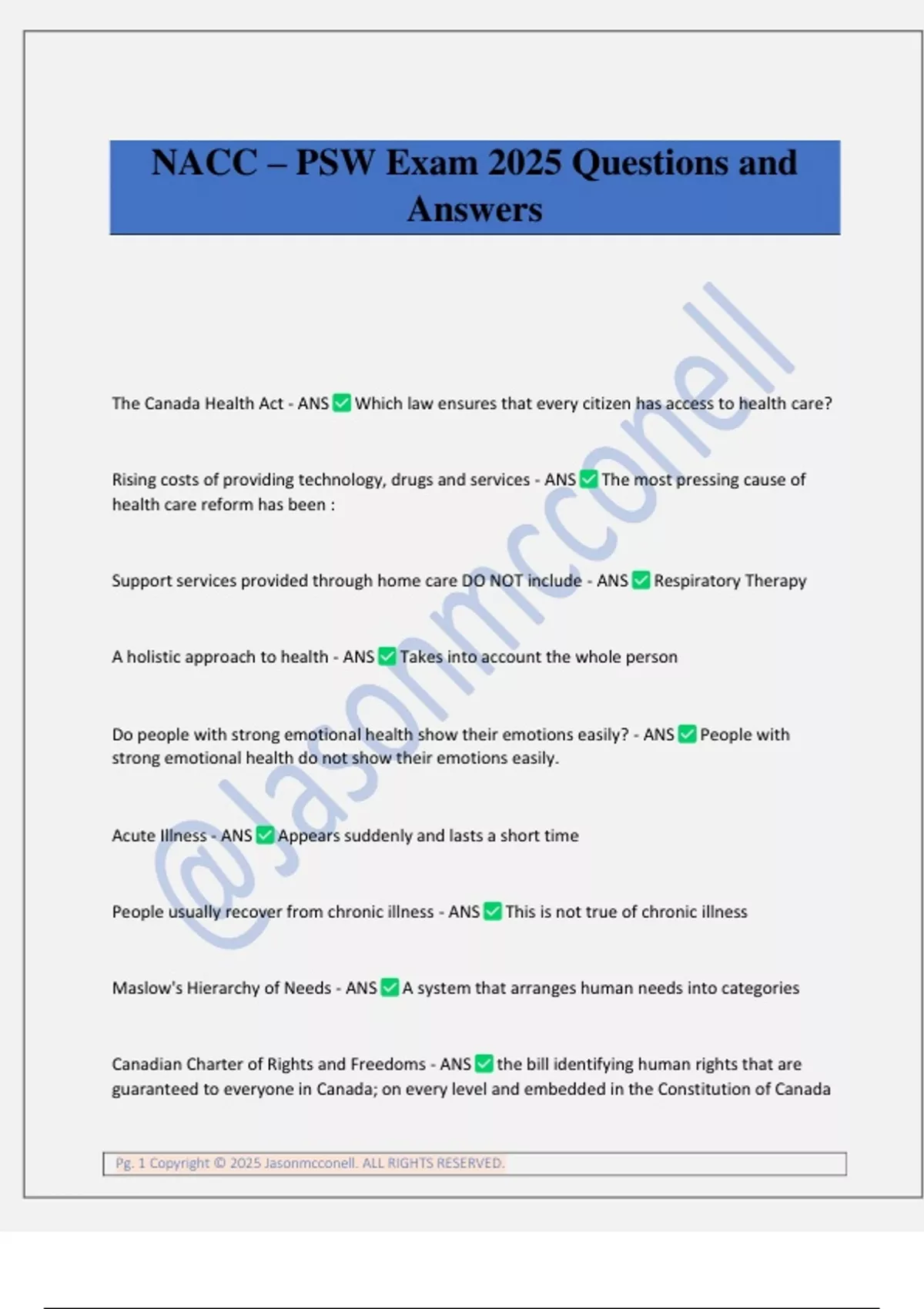 Pg. 1 Copyright © 2025 Jasonmcconell. ALL RIGHTS RESERVED. NACC – PSW Exam 2025 Questions and Answers The Canada Health Act - ANS Which law ensures that every citizen has access to health care? Rising costs of providing technology, drugs and services - ANS The most pressing cause of health care reform has been : Support services provided through home care DO NOT include - ANS Respiratory Therapy A holistic approach to health - ANS Takes into account the whole person Do people with strong emotional health show their emotions easily? - ANS People with strong emotional health do not show their emotions easily. Acute Illness - ANS Appears suddenly and lasts a short time People usually recover from chronic illness - ANS This is not true of chronic illness Maslow's Hierarchy of Needs - ANS A system that arranges human needs into categories Canadian Charter of Rights and Freedoms - ANS the bill identifying human rights that are guaranteed to everyone in Canada; on every level and embedded in the Constitution of Canada Pg. 2 Copyright © 2025 Jasonmcconell. ALL RIGHTS RESERVED. Provincial Human Rights Codes - ANS Freedom from discrimination, harassment. Equal treatment with respect to services and facilities, age, sex, ethnicity. Does not promote the right to vote informed consent - ANS Must include information about the nature of the treatment, discuss potential risks and side effects, likely consequences of not having the treatment. Does not include reassurance that this is the best and only option. Negligence - ANS careless neglect, often resulting in injury. Prison term is unlikely. Assault - ANS Intentional attempt or threat to touch a persons body without the persons consent. False Imprisonment - ANS the illegal restraint of another person's movement prejudice - ANS preconceived opinion that is not based on reason or actual experience Activities of Daily Living - ANS Self care activities that people perform to remain independant and function in society Unregulated Health Care Provider - ANS Personal Support Worker Professionalism - ANS An approach to work that demonstrates a respect for others, commitment, competence and appropriate behaviour Hospitals - ANS Work settings that provide acute care respite services - ANS