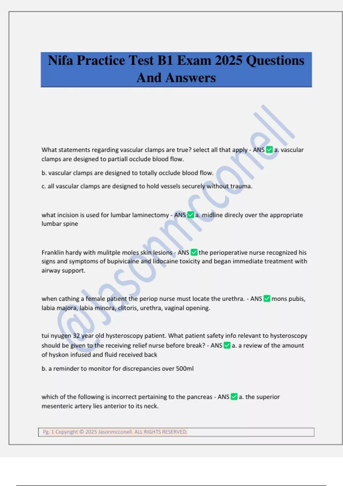 Pg. 1 Copyright © 2025 Jasonmcconell. ALL RIGHTS RESERVED. Nifa Practice Test B1 Exam 2025 Questions And Answers What statements regarding vascular clamps are true? select all that apply - ANS a. vascular clamps are designed to partiall occlude blood flow. b. vascular clamps are designed to totally occlude blood flow. c. all vascular clamps are designed to hold vessels securely without trauma. what incision is used for lumbar laminectomy - ANS a. midline direcly over the appropriate lumbar spine Franklin hardy with mulitple moles skin lesions - ANS the perioperative nurse recognized his signs and symptoms of bupivicaine and lidocaine toxicity and began immediate treatment with airway support. when cathing a female patient the periop nurse must locate the urethra. - ANS mons pubis, labia majora, labia minora, clitoris, urethra, vaginal opening. tui nyugen 32 year old hysteroscopy patient. What patient safety info relevant to hysteroscopy should be given to the receiving relief nurse before break? - ANS a. a review of the amount of hyskon infused and fluid received back b. a reminder to monitor for discrepancies over 500ml which of the following is incorrect pertaining to the pancreas - ANS a. the superior mesenteric artery lies anterior to its neck. Pg. 2 Copyright © 2025 Jasonmcconell. ALL RIGHTS RESERVED. a number of screening tools have been developed for comprehensive geriatric assessment (CGA) - ANS d. indentifying at-risk individuals blunt force to the larnyz can result in fracture and impose immediate airway obstruction - ANS a. assist the anesthesia provider with securing the airway while applying cricoid pressure recommended long-term pain management in the elderly includes - ANS c. opoid analgesics (low potential for addiction) select the statement that most correctly matches a risk factor for adhesions with an appropriate preventitive strategy - ANS c. patients with endometriosis may be best served with a laparoscopic approach another name for the left colic flexure is - ANS splenic flexure which of the following is not typically visable in a PA chest radiograph - ANS a. the interventricular septum an exapmple of an indicaiton for liver transplantation would be - ANS d. primary hepatic cancer which of the following associations is correct - ANS e. pancreatic cancer-rarely metastasizes replantation is an attempt to reattach a completely amputated digit or other body part. good candidates for replantation ar