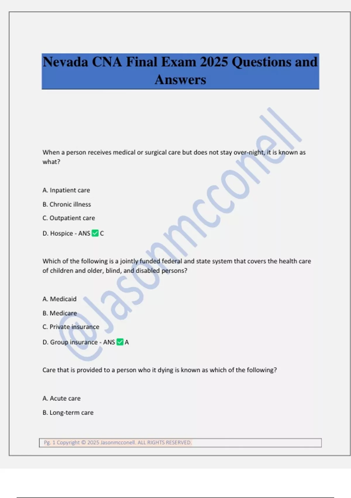 Nevada CNA Final Exam 2025 Questions and Answers When a person receives medical or surgical care but does not stay over-night, it is known as what? A. Inpatient care B. Chronic illness C. Outpatient care D. Hospice - ANS C Which of the following is a jointly funded federal and state system that covers the health care of children and older, blind, and disabled persons? A. Medicaid B. Medicare C. Private insurance D. Group insurance - ANS A Care that is provided to a person who it dying is known as which of the following? A. Acute care B. Long-term care Pg. 2 Copyright © 2025 Jasonmcconell. ALL RIGHTS RESERVED. C. Assisted living D. Hospice - ANS D A memory care unit is used for which of these conditions? A. Alzheimer's disease B. Death and dying C. Mental health D. Rehabilitation - ANS A Which of the following purposes of health care is accomplished when a person learns about healthy living? A. Health promotion B. Disease prevention C. Treatment of disease D. Rehabilitation - ANS A What is a sudden illness from which a person is expected to recover? A. Chronic illness B. Acute illness C. Terminal illness D. Palliative illness - ANS A What is a registered nurse with limited diagnosing and prescribing functions? Pg. 3 Copyright © 2025 Jasonmcconell. ALL RIGHTS RESERVED. A. Director of nursing B. Licensed practical nurse C. Case manager D. Nurse practitioner - ANS D What is the focus of care in any health care agency? A. Reimbursement B. Caregivers C. Staff members D. The person - ANS D What is the role of the nursing case manager? A. Focuses on tasks and jobs. B. Delegates care of patient to other nurses and nursing assistants. C. Coordinates care of specific groups of patients from admission through discharge. D. Provides total patient care. - ANS C What is one of the requirements for being the director of nursing (DON) within an organization? A. The DON is an RN. B. The DON is a licensed vocational nurse. C. The DON has a business or law degree. D. The DON has an ass