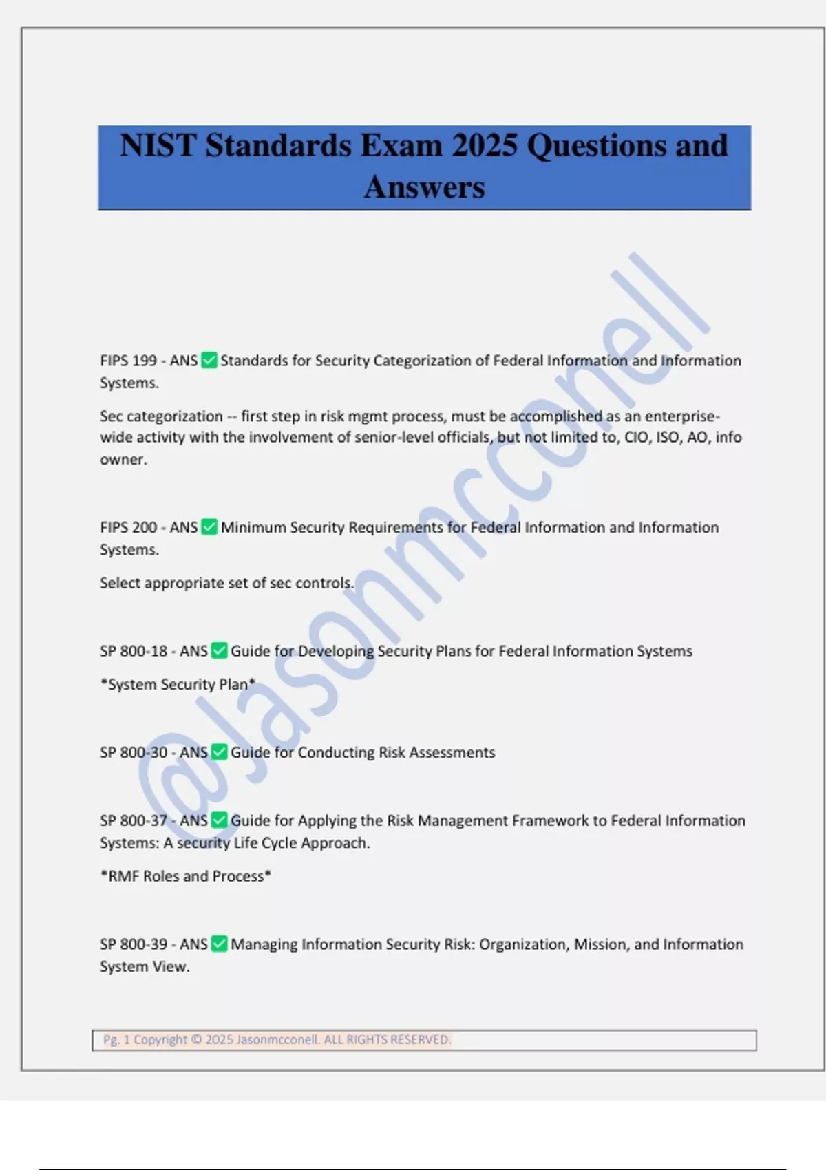 NIST Standards Exam 2025 Questions and Answers FIPS 199 - ANS Standards for Security Categorization of Federal Information and Information Systems. Sec categorization -- first step in risk mgmt process, must be accomplished as an enterprise- wide activity with the involvement of senior-level officials, but not limited to, CIO, ISO, AO, info owner. FIPS 200 - ANS Minimum Security Requirements for Federal Information and Information Systems. Select appropriate set of sec controls. SP 800-18 - ANS Guide for Developing Security Plans for Federal Information Systems *System Security Plan* SP 800-30 - ANS Guide for Conducting Risk Assessments SP 800-37 - ANS Guide for Applying the Risk Management Framework to Federal Information Systems: A security Life Cycle Approach. *RMF Roles and Process* SP 800-39 - ANS Managing Information Security Risk: Organization, Mission, and Information System View.