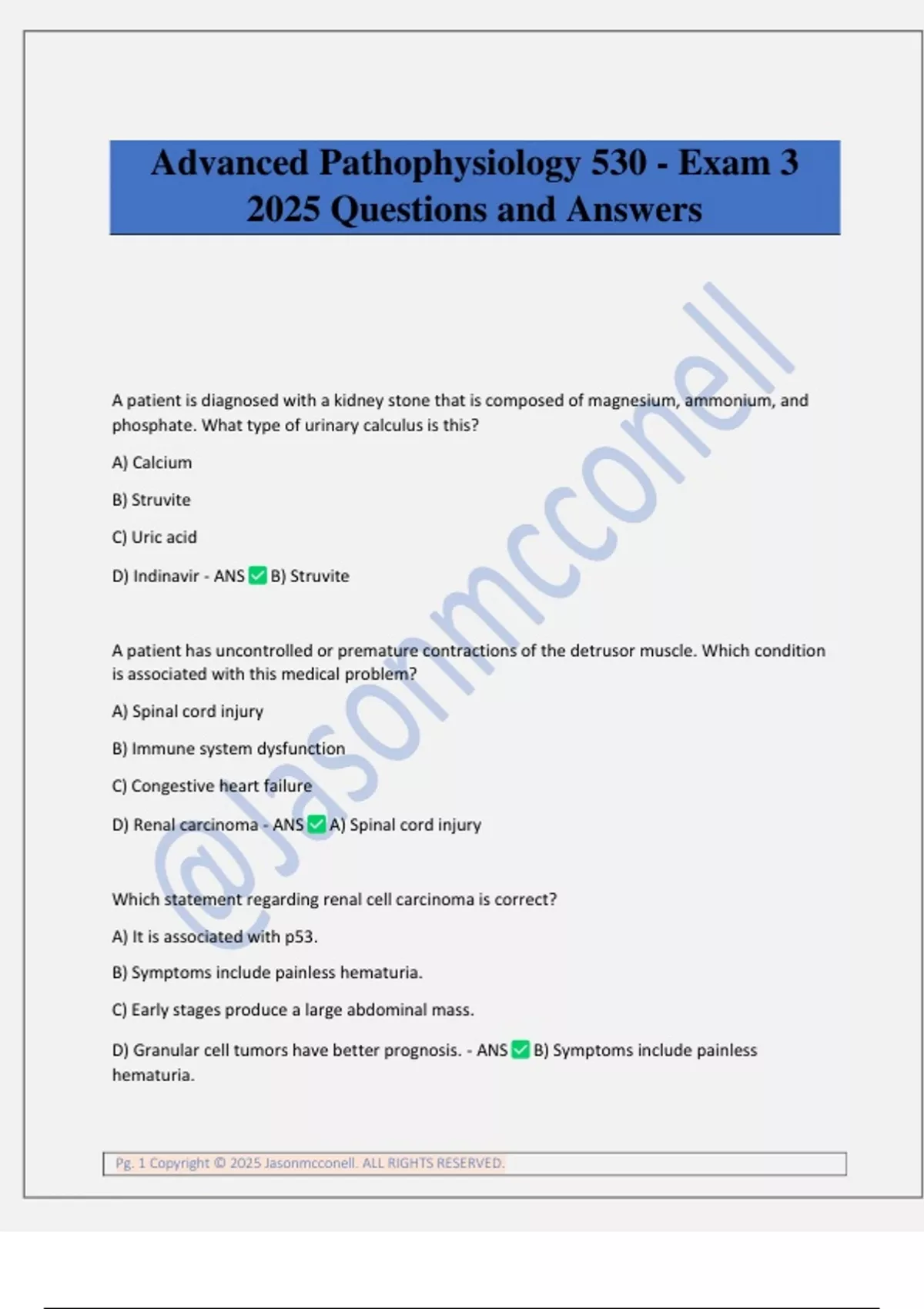 Advanced Pathophysiology 530 - Exam 3 2025 Questions and Answers A patient is diagnosed with a kidney stone that is composed of magnesium, ammonium, and phosphate. What type of urinary calculus is this? A) Calcium B) Struvite C) Uric acid D) Indinavir - ANS B) Struvite A patient has uncontrolled or premature contractions of the detrusor muscle. Which condition is associated with this medical problem? A) Spinal cord injury B) Immune system dysfunction C) Congestive heart failure D) Renal carcinoma - ANS A) Spinal cord injury Which statement regarding renal cell carcinoma is correct? A) It is associated with p53. B) Symptoms include painless hematuria. C) Early stages produce a large abdominal mass. D) Granular cell tumors have better prognosis. - ANS B) Symptoms include painless hematuria. Pg. 2 Copyright © 2025 Jasonmcconell. ALL RIGHTS RESERVED. A patient who reports abdominal and back pain has been diagnosed with bacteria in the urine. What is the appropriate term for involvement of the upper urinary tract that is likely to cause such symptoms? A) Cystitis B) Pyelonephritis C) Urinary tract infection D) Asymptomatic bacteriuria - ANS B) Pyelonephritis With which bacteria is acute glomerulonephritis associated? A) Escherichia coli B) Staphylococcus C) Group A Streptococcus D) Klebsiella - ANS C) Group A Streptococcus A diabetic child with 4.0 g of protein in her urine each day is experiencing edema and vitamin D deficiency. Which is the most likely diagnosis? A) Nephritic syndrome B) Nephrotic syndrome C) Acute renal failure D) Rapidly progressive glomerulonephritis - ANS Nephrotic syndrome A 2-month-old male patient presents with the urethral opening on the dorsal surface of the penis. Which term is the correct name for this anomaly? A) Hypospadias B) Epispadias C) Exstrophy D) Ureteropelvic junction - ANS Epispadias Pg. 3 Copyright © 2025 Jasonmcconell. ALL RIGHTS RESERVED. A patient presents with wide-set eyes, "parrot beak" nose, low-set ears, and receding chin. What is the renal manifestation associated with this presentation? A) Potter syndrome B) Polycystic kidney disease C) Infundibular stenosis D) Megacalycosis - ANS Potter syndrome A 6-year-old has just recovered from streptococcal pharyngitis. Which statement regarding this child's acute poststreptococcal glomerulonephritis is true? A) Antibody-antigen complexes of IgM, IgG, and IgA are deposited. B) The exact mechanism of immune complexes is unknown. C) There is decreased vascular permeability. D) No signs of inflammation are present. - ANS The exact mechanism of immune complexes is unknown. A patient presents with skin lesions as well as hematuria, proteinuria, and abdominal pain. Which is the most likely cause of these symptoms? A) Henoch-Schonlein purpura B) Hemolytic uremic syndrome C) Primary nephrotic syndrome D) Minimal change nephropathy - ANS Henoch-Schonlein purpura What is the cause of minimal change nephropathy? A) Fusion of the glomerular foot processes B) Verotoxin of E. c