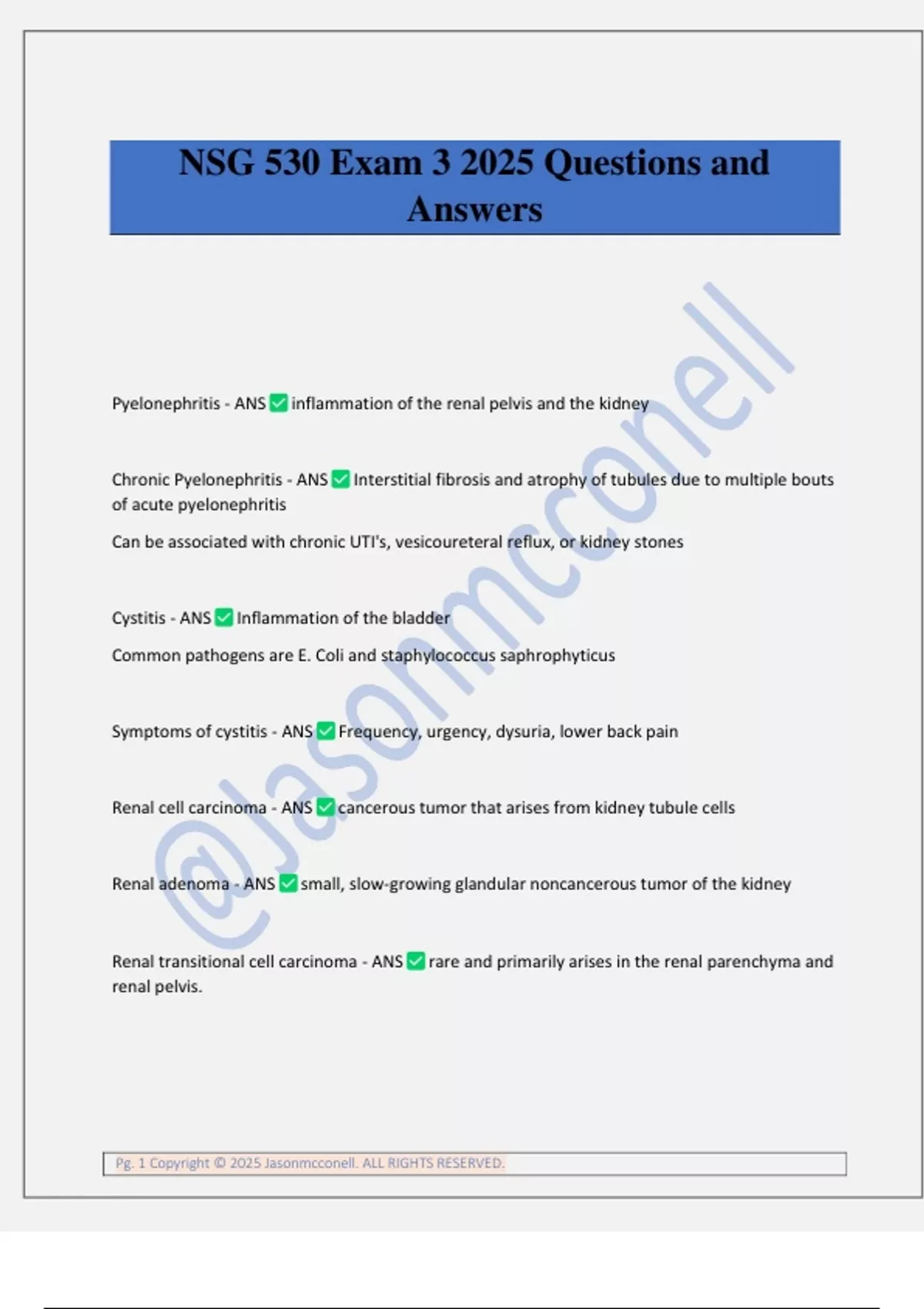 NSG 530 Exam 3 2025 Questions and Answers Pyelonephritis - ANS inflammation of the renal pelvis and the kidney Chronic Pyelonephritis - ANS Interstitial fibrosis and atrophy of tubules due to multiple bouts of acute pyelonephritis Can be associated with chronic UTI's, vesicoureteral reflux, or kidney stones Cystitis - ANS Inflammation of the bladder Common pathogens are E. Coli and staphylococcus saphrophyticus Symptoms of cystitis - ANS Frequency, urgency, dysuria, lower back pain Renal cell carcinoma - ANS cancerous tumor that arises from kidney tubule cells Renal adenoma - ANS small, slow-growing glandular noncancerous tumor of the kidney Renal transitional cell carcinoma - ANS rare and primarily arises in the renal parenchyma and renal pelvis. Pg. 2 Copyright © 2025 Jasonmcconell. ALL RIGHTS RESERVED. Transitional cell carcinoma - ANS a malignant tumor of the urinary tract that is often found within the urinary bladder or within the renal pelvis. Generally occurs in older men. Gross painless hematuria Gomerulonephritis - ANS inflammation of the glomeruli within the kidney Primary glomerulonephritis - ANS inflammation of the glomeruli of the kidneys that occurs independently of other chronic conditions; usually the result of an acute infectious process secondary glomerulonephritis - ANS inflammation of the glomeruli of the kidneys that results from other chronic conditions, such as lupus erythematosus or diabetes. Symptoms of glomerulonephritis - ANS Hematuria with red blood cell casts, proteinuria with albumin, oliguria, HTN, edema, nephrotic sediment Types of glomerulonephritis - ANS - membranous nephropathy/ glomerulonephritis - rapidly progressing glomerulonephritis -Anti-glomerular basement membrane disease (goodpasture syndrome) - chronic glomerulonephritis -diabetic neuropathy Nephrotic syndrome - ANS loss of large amounts of plasma protein, usually albumin, through urine due to an increased permeability of the glomerular membrane Causes of nephrotic syndrome - ANS Membranous glomerulonephritis Minimal change nephropathy Focal segmental glomerulosclerosis -systemic disease such a