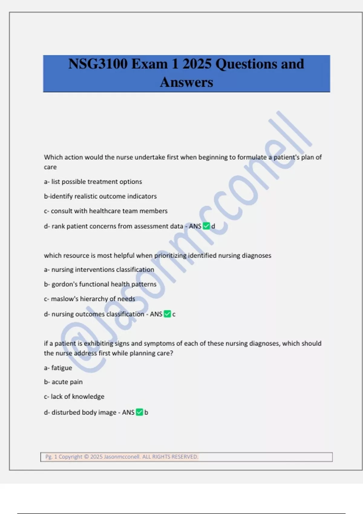 NSG3100 Exam 1 2025 Questions and Answers Which action would the nurse undertake first when beginning to formulate a patient's plan of care a- list possible treatment options b-identify realistic outcome indicators c- consult with healthcare team members d- rank patient concerns from assessment data - ANS d which resource is most helpful when prioritizing identified nursing diagnoses a- nursing interventions classification b- gordon's functional health patterns c- maslow's hierarchy of needs d- nursing outcomes classification - ANS c if a patient is exhibiting signs and symptoms of each of these nursing diagnoses, which should the nurse address first while planning care? a- fatigue b- acute pain c- lack of knowledge d- disturbed body image - ANS b Pg. 2 Copyright © 2025 Jasonmcconell. ALL RIGHTS RESERVED. which statement illustrates a characteristic of goals within the care planning process? a- goals are vague objectives communicating expectations for improvement b- short-term goals need not be measurable, unlike long term goals c- goal attainment can be measured by identifying nursing interventions d- long term goals are helpful in judging a patient's progress - ANS d which nursing goal is written correctly for a patient with the nursing diagnosis for risk for infection after abdominal surgery? a- nurse will encourage use of sterile technique during each dressing change b- patient's WBC will remain within normal range throughout hospitalization c- patient's visitors will be instructed in proper handwashing before direct interaction with patient d- patient will understand the importance of cleaning around the incision with a clean cloth during bath time - ANS b If the nurse chooses the Nursing Outcome Classification (NOC), Appetite (1014) for a chemotherapy patient, which outcome indicators would be acceptable for evaluation of goal attainment? (Select all that apply.) a. Expressed desire to eat b. Report that food smells good c. Use of relaxation techniques before meals d. Preparation of home-cooked meals for self and family e. Uses nutritional information on labels to guide selections - ANS a, b, d which action by the nurse would be most important in developing a patient-centered plan of care for an alert, oriented adult a- providing a written copy of care options to the patient and family b- collaborrating with the patient's social worker to determine resources c- listening to patient's concerns and beliefs about proposed treatment Pg. 3 Copyright © 2025 Jasonmcconell. ALL RIGHTS RESERVED. d- engaging the patient's family, friends or care providers in conversation - ANS c which interventions can the nurse initiate independently while providing patient care? a- ordering blood transfusion b- auscultating lung sounds c- monitoring skin integrity d- apply heel protectors e- adjusting antibiotic dosages - ANS b,c,d the nurse notices that a patient is becoming short of breath and anxious. which intervention is dependent nursing action, requiring the order of a PCP? a- elevating the head of the patient's bed b- administering oxygen by nasal cannula c- assessing the patient's O2 saturation d- elevating the patient's peripheral circulation - ANS b which situation indicates the greatest need for collaborative interventions provided by several health care team members? a- hospice referral b- physical assessment c- activities of daily living d- health history interview - ANS a what should the nurse consider before implementation of all nursing interventions a- potential communication barriers b- diverse cultural practices c- scope of nursing practice d- functional status of p