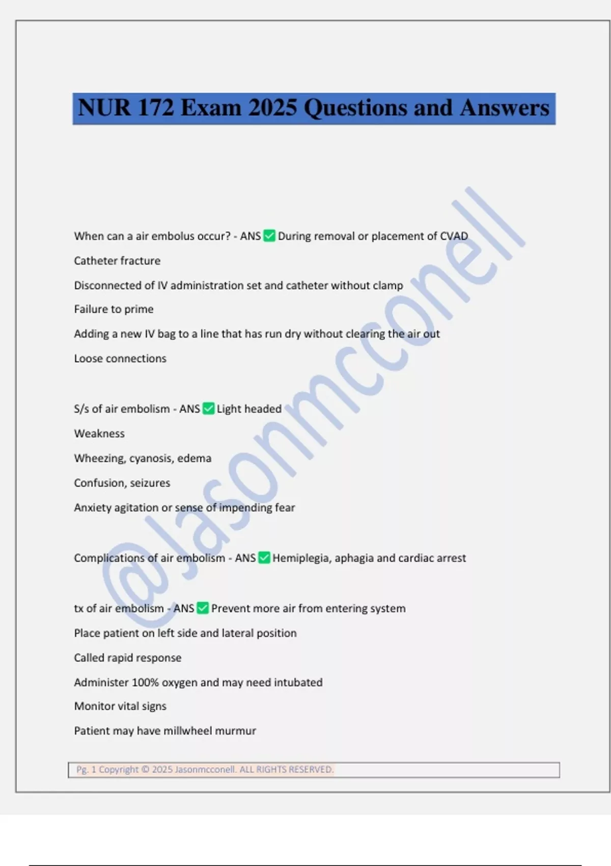 NUR 172 Exam 2025 Questions and Answers When can a air embolus occur? - ANS During removal or placement of CVAD Catheter fracture Disconnected of IV administration set and catheter without clamp Failure to prime Adding a new IV bag to a line that has run dry without clearing the air out Loose connections S/s of air embolism - ANS Light headed Weakness Wheezing, cyanosis, edema Confusion, seizures Anxiety agitation or sense of impending fear Complications of air embolism - ANS Hemiplegia, aphagia and cardiac arrest tx of air embolism - ANS Prevent more air from entering system Place patient on left side and lateral position Called rapid response Administer 100% oxygen and may need intubated Monitor vital signs Patient may have millwheel murmur