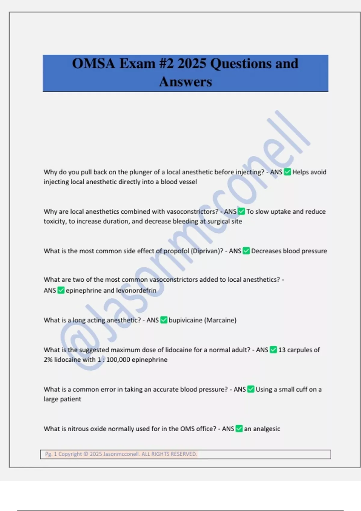 OMSA Exam #2 2025 Questions and Answers Why do you pull back on the plunger of a local anesthetic before injecting? - ANS Helps avoid injecting local anesthetic directly into a blood vessel Why are local anesthetics combined with vasoconstrictors? - ANS To slow uptake and reduce toxicity, to increase duration, and decrease bleeding at surgical site What is the most common side effect of propofol (Diprivan)? - ANS Decreases blood pressure What are two of the most common vasoconstrictors added to local anesthetics? - ANS epinephrine and levonordefrin What is a long acting anesthetic? - ANS bupivicaine (Marcaine) What is the suggested maximum dose of lidocaine for a normal adult? - ANS 13 carpules of 2% lidocaine with 1 : 100,000 epinephrine What is a common error in taking an accurate blood pressure? - ANS Using a small cuff on a large patient What is nitrous oxide no
