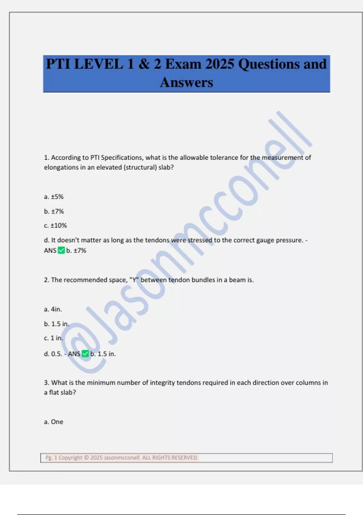 PTI LEVEL 1 & 2 Exam 2025 Questions and Answers 1. According to PTI Specifications, what is the allowable tolerance for the measurement of elongations in an elevated (structural) slab? a. ±5% b. ±7% c. ±10% d. It doesn't matter as long as the tendons were stressed to the correct gauge pressure. - ANS b. ±7% 2. The recommended space, "Y" between tendon bundles in a beam is. a. 4in. b. 1.5 in. c. 1 in. d. 0.5. - ANS b. 1.5 in. 3. What is the minimum number of integrity tendons required in each direction over columns in a flat slab? a. One Pg. 2 Copyright © 2025 Jasonmcconell. ALL RIGHTS RESERVED. b. Two c. Three d. There is no minimum requirement. - ANS b. Two 4. In an encapsulated system, how much bare strands is acceptable behind stressing anchorage? a. None b. ½" maximum c. 6" maximum d. It does not matter. - ANS a. None 5. Longitudinal cracking of wedges may occur and is acceptable as a result of wedges moving to their final wedge set position. a. True b. False - ANS a. True 6. What should be done when the beam stirrup spacing does not match the PT support bar spacing? a. Move the support bar to the nearest stirrup location and adjust the vertical height so that a smooth tendon profile is maintained, add additional support bars at other stirrup locations if needed so a maximum allowable support spacing is not exceeded. b. Change the spacing of the beam stirrup to match the support bar spacing. c. Do not proceed with installation until further instructions are received. d. None of the above. - ANS a. Move the support bar to the nearest stirrup location and adjust the vertical height so that a smooth tendon profile is maintained, add additional support bars at other stirrup locations if needed so a maximum allowable support spacing is not exceeded. Pg. 3 Copyright © 2025 Jasonmcconell. ALL RIGHTS RESERVED. 7. When installing tendons in a narrow joist: a. It is important to avoid excessive wobble in tendons that could lead to concrete blowouts. b. Tendon placement is not critical since there is only one tendon in each joist. c. It is important to check for any reverse curvature in a tendon profile to avoid problems. d. Both A and C. - ANS a. It is important to avoid excessive wobble in tendons that could lead to concrete blowouts. 8. Of the following, what is the most important thing a contractor must do when field installing a fixed-end anchor? a. Firmly hammer the wedges into the back of the anchor. b. Grease the wedges before installing them in the anchor to reduce friction. c. Stress the anchor to the full required jacking force. d. None of the abo