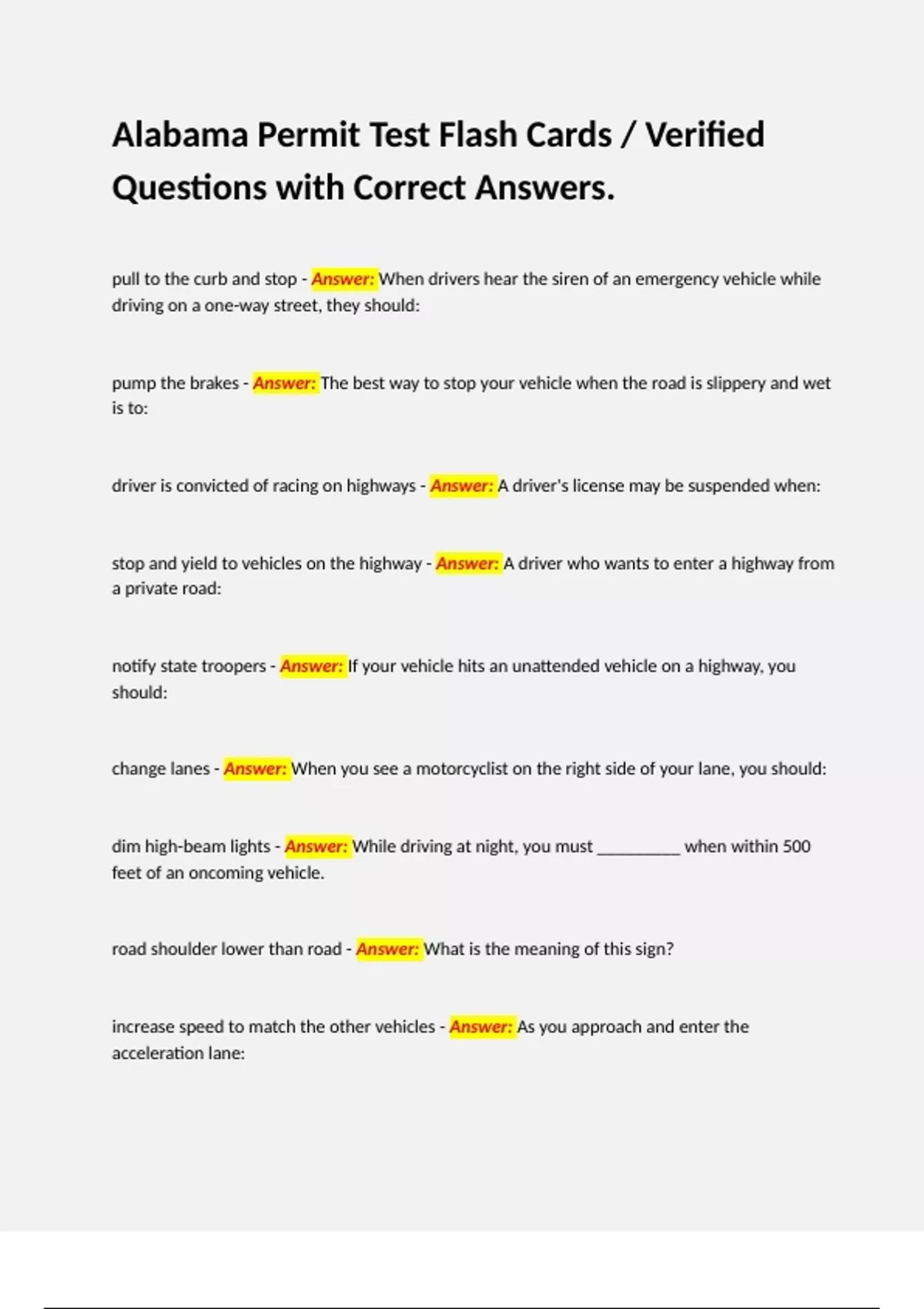 Alabama Permit Test Flash Cards / Verified Questions with Correct Answers.