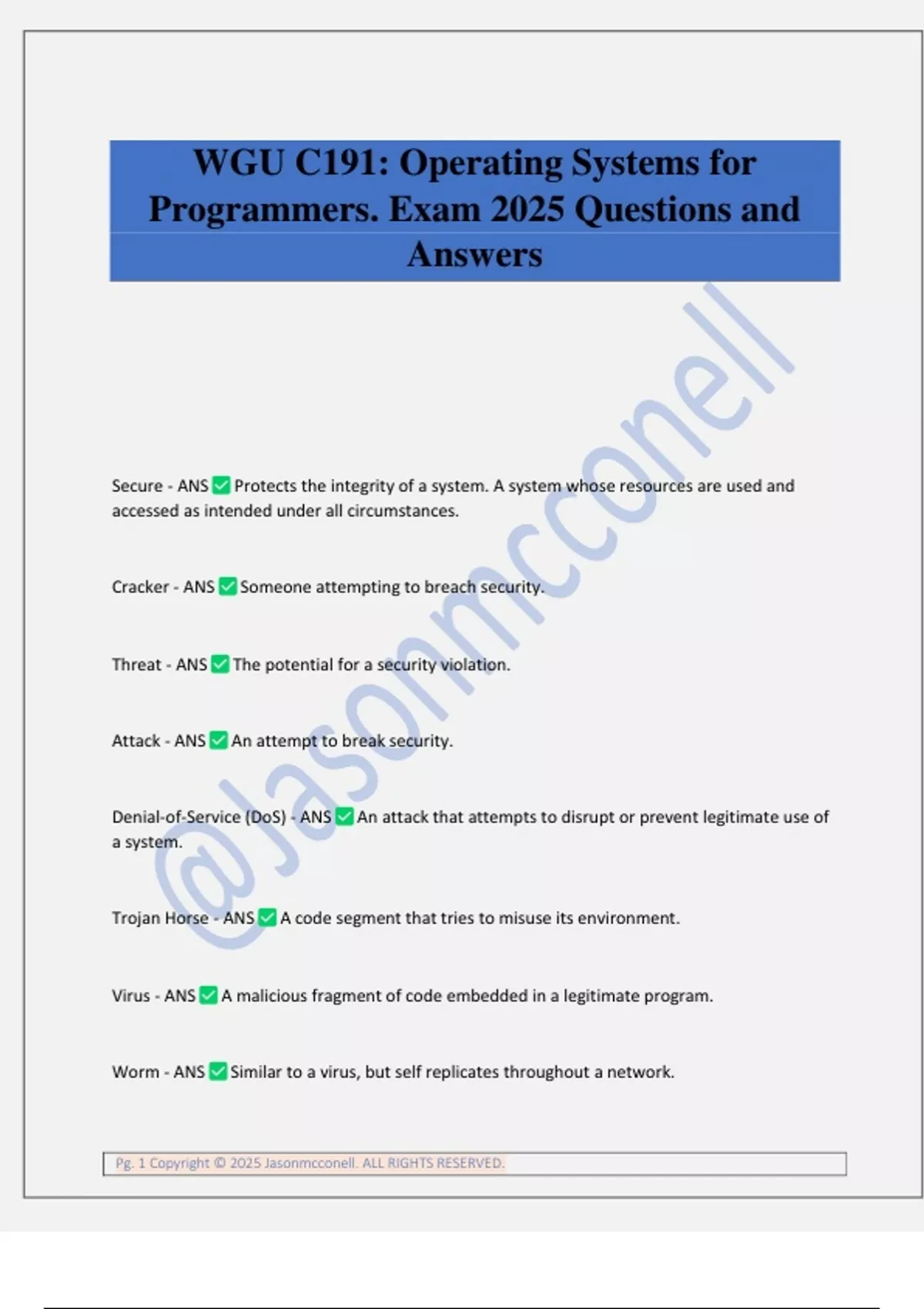WGU C191: Operating Systems for Programmers. Exam 2025 Questions and Answers Secure - ANS Protects the integrity of a system. A system whose resources are used and accessed as intended under all circumstances. Cracker - ANS Someone attempting to breach security. Threat - ANS The potential for a security violation. Attack - ANS An attempt to break security. Denial-of-Service (DoS) - ANS An attack that attempts to disrupt or prevent legitimate use of a system. Trojan Horse - ANS A code segment that tries to misuse its environment. Virus - ANS A malicious fragment of code embedded in a legitimate program. Worm - ANS Similar to a virus, but self replicates throughout a network. Pg. 2 Copyright © 2025 Jasonmcconell. ALL RIGHTS RESERVED. Domain - ANS Specifies resources a process may access. Specifies a set of objects and the operations that may be invoked on those objects. Set of access rights. Protection - ANS A mechanism for controlling the access of programs, processes, or users to the resources defined by a computer system. Security - ANS Requires not only an adequate protection of system, but also consideration of the external environment within which the system operates (i.e., threats and attacks). Breach of Confidentiality - ANS Gaining access to information, credit card numbers, personal information, etc. Breach of Integrity - ANS Modified data. Breach of Availability - ANS Destruction of data. Theft of Service - ANS Unauthorized use of resources such as using a server as a personal file server. Trap Door - ANS A hole purposely left in a software program that only the programmer is capable of using. UNIX Domain Association - ANS A UNIX domain is associated with a user. Masquerading - ANS The most common method used by an attacker. Principle of Least Privilege - ANS Where just enough privilege is given to perform a task. Pg. 3 Copyright © 2025 Jasonmcconell. ALL RIGHTS RESERVED. Need-to-Know Principle - ANS Where a process is only given access to resources it currently needs. Copy and Owner Rights - ANS Rights needed to change entries in a column of an access matrix. Control Rights - ANS Rights needed to change entries in a row of an access matrix. Role-Based Access Control - ANS A type of control where privileges and programs are assigned roles, and users are assigned roles based on passwords. Compiler-Based Enforcement - ANS A type of enforcement where protection needs are declared rather than programmed. Kernel-Based Enforcement - ANS Enforcement provided by the subsystem designer. The 4 Levels of Security - ANS Physical - site must be secured. Human - only appropriate users have access. OS - system must be able to protect itself. Network - network must be secured. Logic Bomb - ANS A security incident initiated when certain logical conditions are met. Stack and Buffer Overflow - ANS A tactic used to gain access to a system by writing into the stack so that a return addr