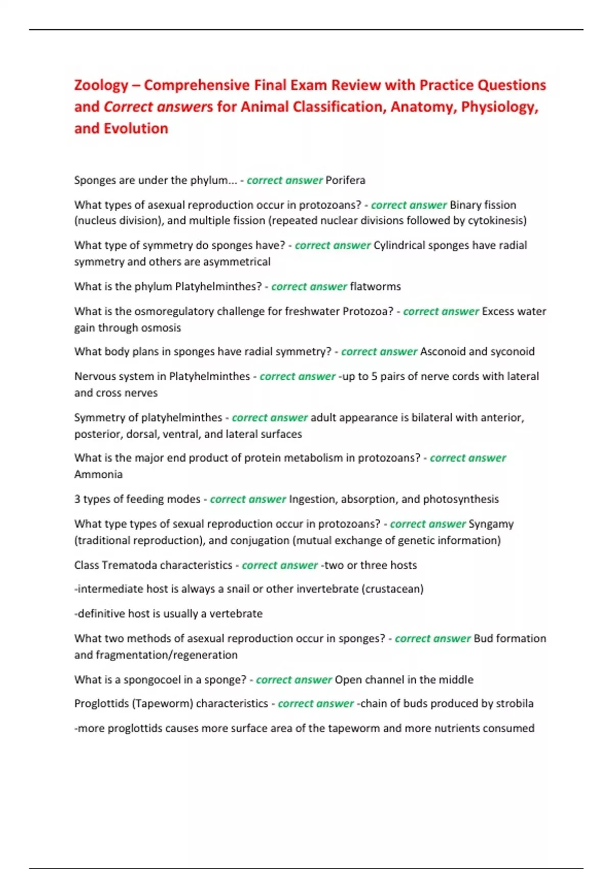 and Correct answers for Animal Classification, Anatomy, Physiology,