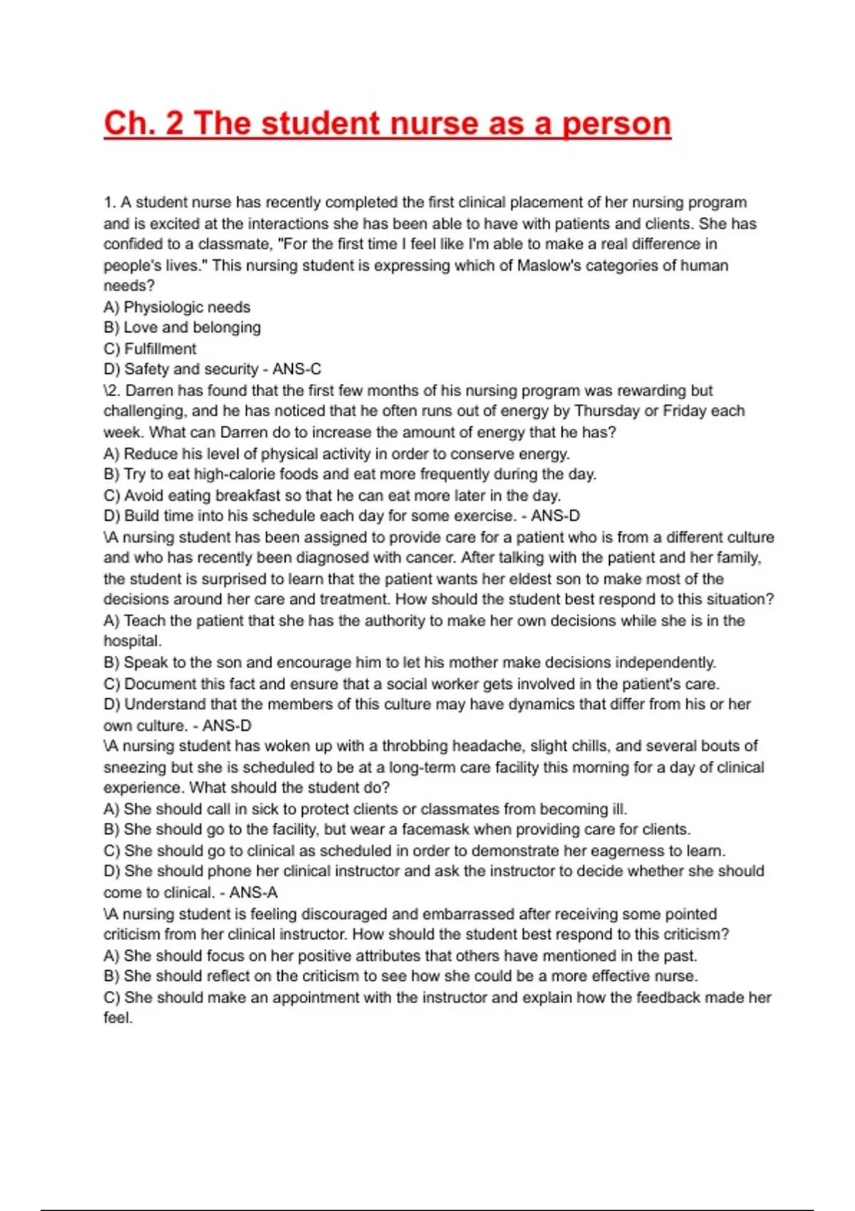 Ch. 2 The student nurse as a person Exam 2025/2026 Questions With Correct Solutions.