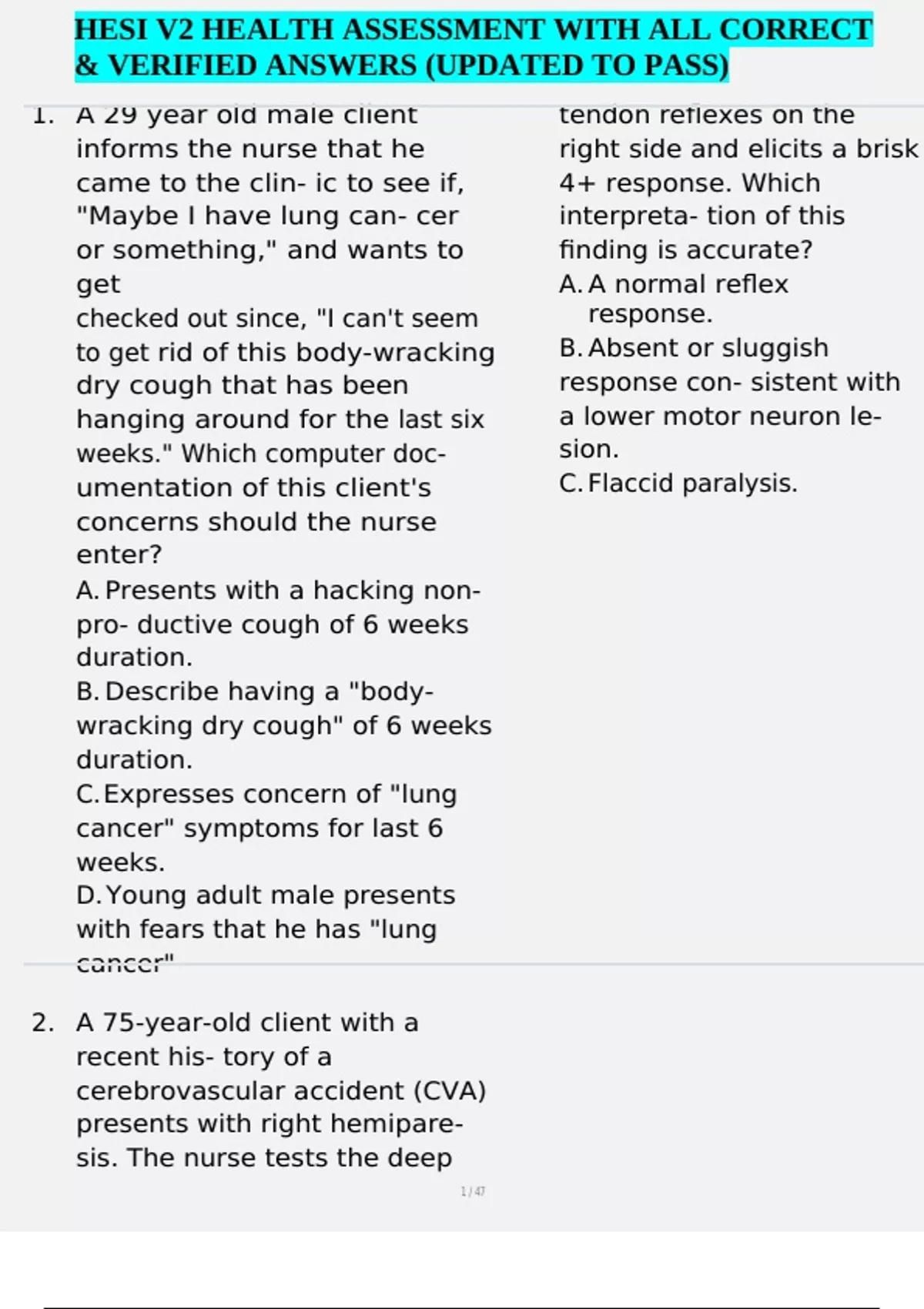 HESI V2 HEALTH ASSESSMENT WITH ALL CORRECT