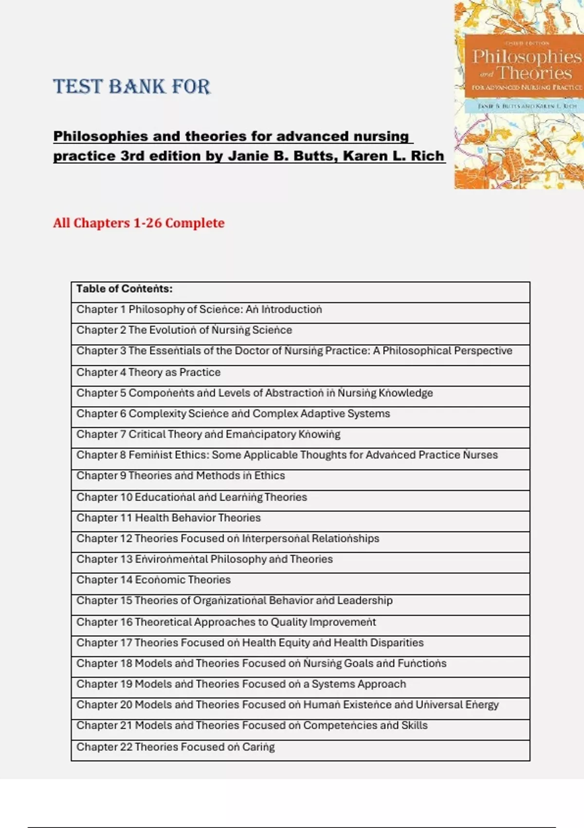 Philosophies and Theories for Advanced Nursing Practice – 3rd Edition (Butts & Rich) Complete Test Bank for Chapters 1–26