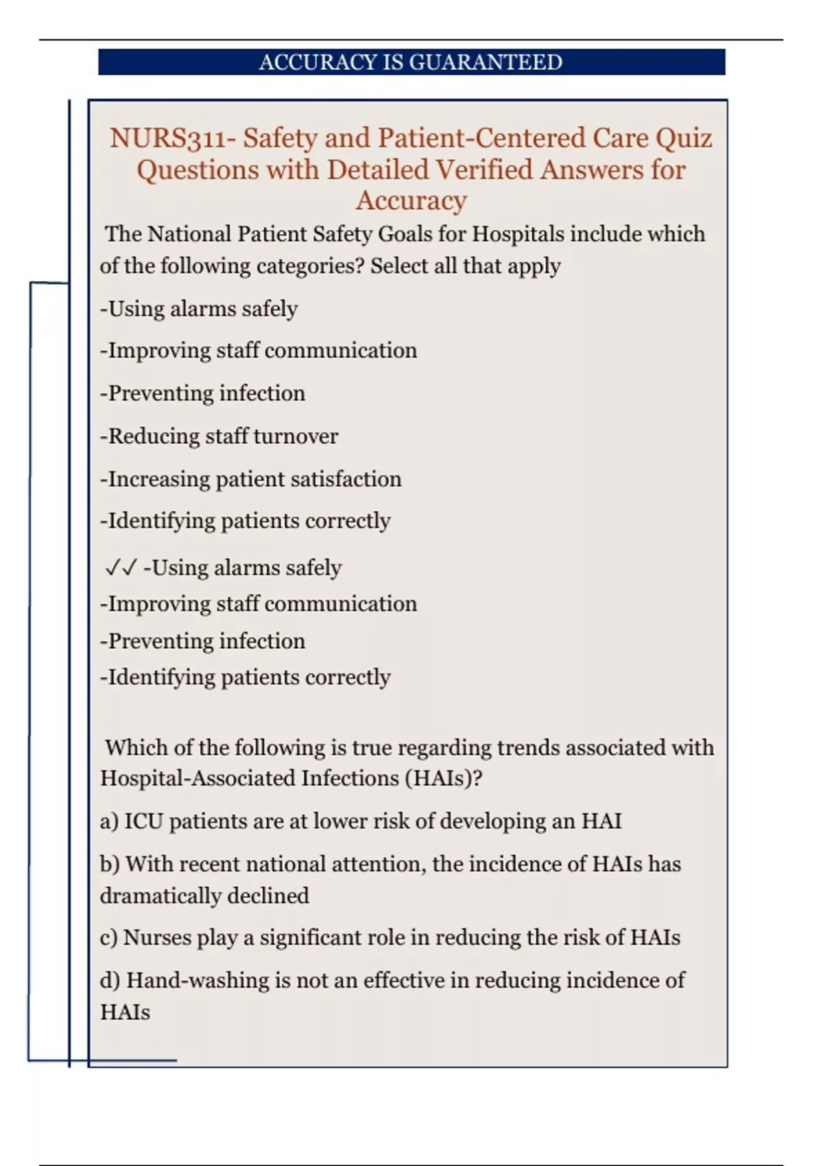 NURS311- Safety and Patient-Centered Care Quiz Questions with Detailed Verified Answers for Accuracy