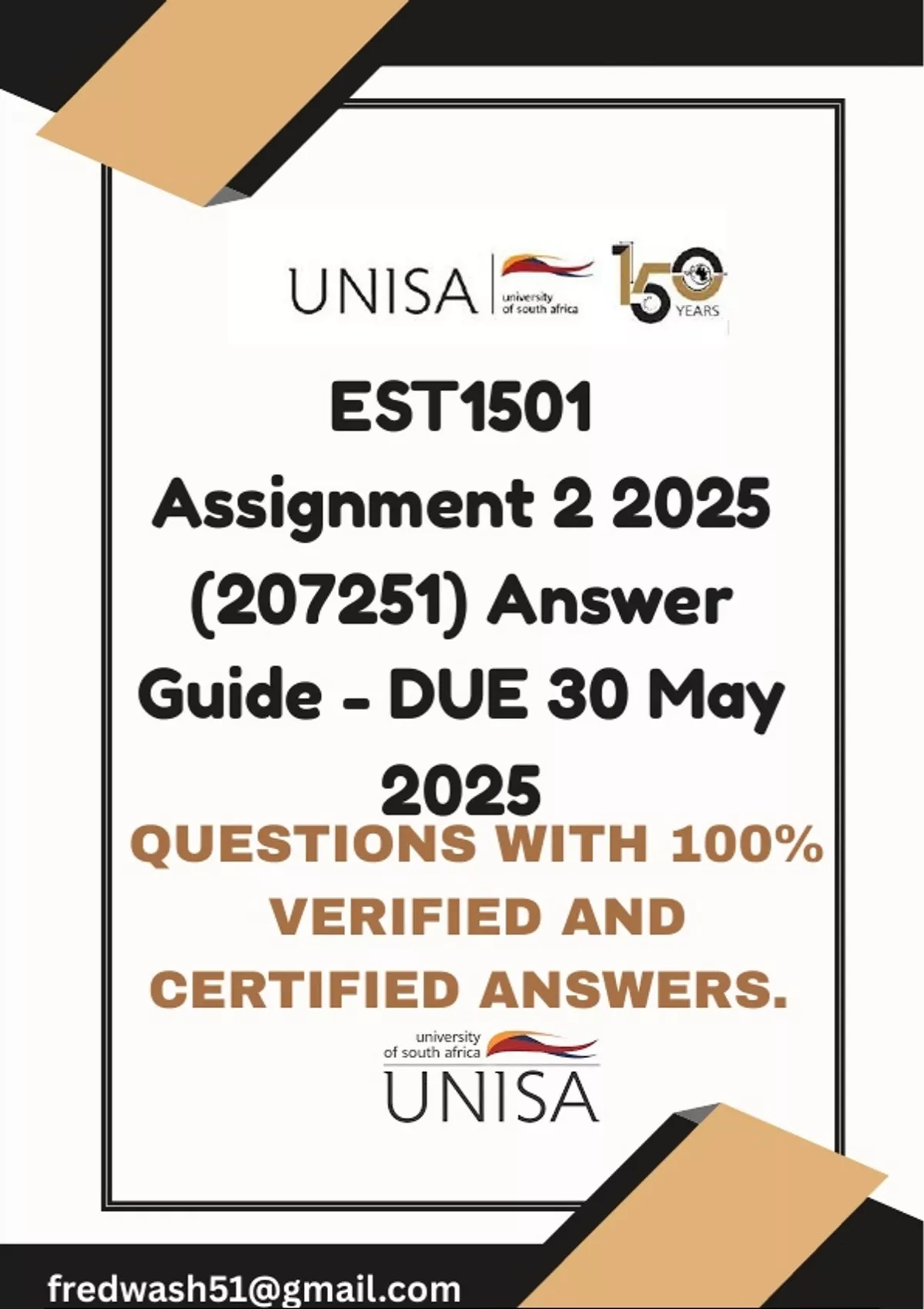 EST1501 Assignment 2 2025 (207251) Answer Guide - DUE 30 May 2025 QUESTIONS WITH 100% VERIFIED AND CERTIFIED ANSWERS. WRITTEN IN REQUIRED FORMAT AND WITHIN GIVEN GUIDELINES. IT IS GOOD TO USE AS A GUIDE AND FOR REFERENCE, NEVER PLAGARIZE. Thank you and success in your academics. UNISA, 2025.