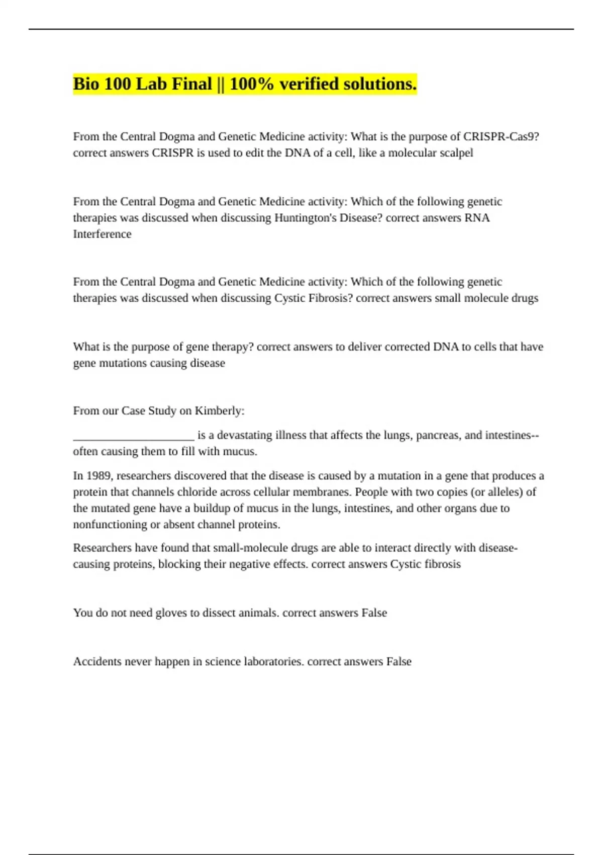 From the Central Dogma and Genetic Medicine activity: What is the purpose of CRISPR-Cas9? correct answers CRISPR is used to edit the DNA of a cell, like a molecular scalpel From the Central Dogma and Genetic Medicine activity: Which of the following genetic therapies was discussed when discussing Huntington's Disease? correct answers RNA Interference From the Central Dogma and Genetic Medicine activity: Which of the following genetic therapies was discussed when discussing Cystic Fibrosis? correct answers small molecule drugs What is the purpose of gene therapy? correct answers to deliver corrected DNA to cells that have gene mutations causing disease From our Case Study on Kimberly: ____________________ is a devastating illness that affects the lungs, pancreas, and intestines-- often causing them to fill with mucus. In 1989, researchers discovered that the disease is caused by a mutation in a gene that produces a protein that channels chloride across cellular membranes. People with two copies (or alleles) of the mutated gene have a buildup of mucus in the lungs, intestines, and other organs due to nonfunctioning or absent channel proteins. Researchers have found that small-molecule drugs are able to interact directly with disease-causing proteins, blocking their negative effects. correct answers Cystic fibrosis You do not need gloves to dissect animals. correct answers False Accidents never happen in science laboratories. correct answers False