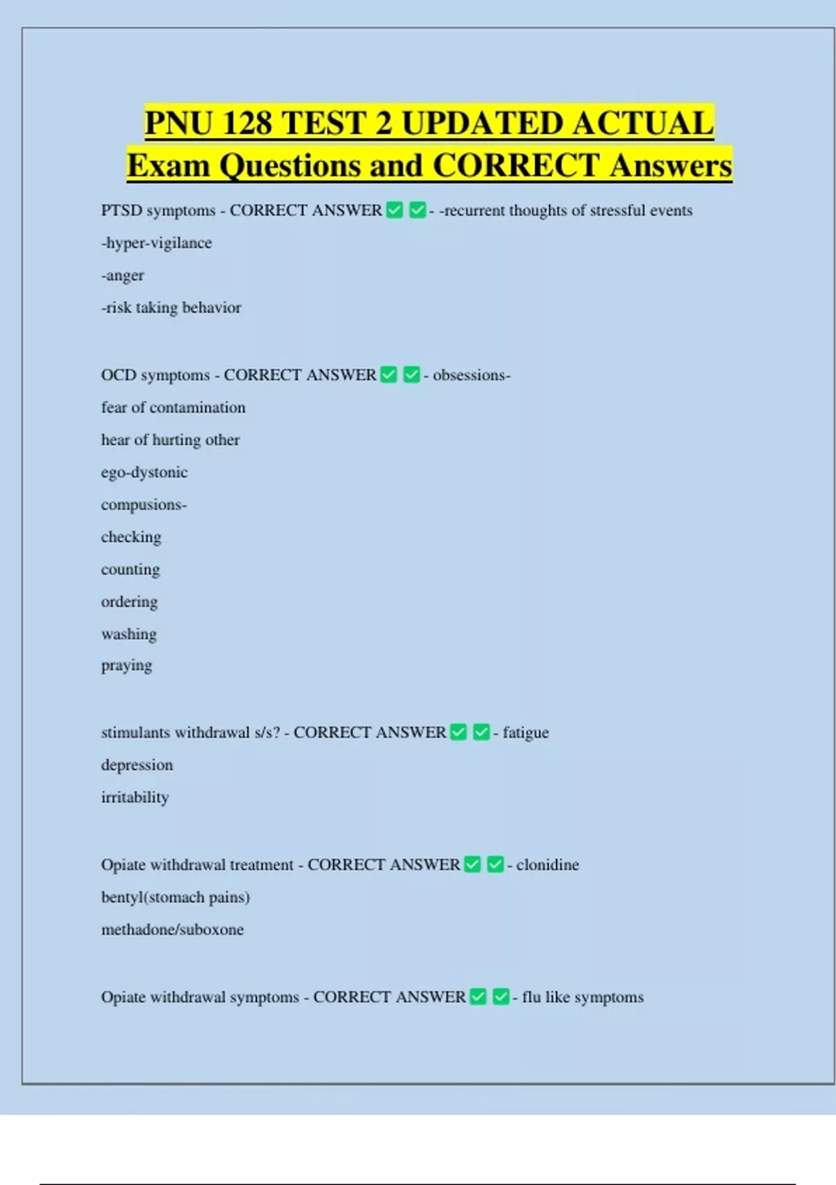 PNU 128 TEST 2 UPDATED ACTUAL Exam Questions and CORRECT Answers PTSD symptoms - CORRECT ANSWER -hyper-vigilance -anger -risk taking behavior OCD symptoms - CORRECT ANSWER fear of contamination hear of hurting other ego-dystonic compusions- checking counting ordering washing praying - -recurrent thoughts of stressful events - obsessions