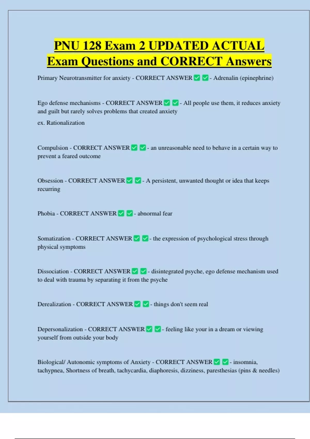 PNU 128 Exam 2 UPDATED ACTUAL Exam Questions and CORRECT Answers Primary Neurotransmitter for anxiety - CORRECT ANSWER Ego defense mechanisms - CORRECT ANSWER - Adrenalin (epinephrine) - All people use them, it reduces anxiety and guilt but rarely solves problems that created anxiety ex. Rationalization Compulsion - CORRECT ANSWER prevent a feared outcome Obsession - CORRECT ANSWER recurring Phobia - CORRECT ANSWER Somatization - CORRECT ANSWER physical symptoms Dissociation - CORRECT ANSWER - an unreasonable need to behave in a certain way to - A persistent, unwanted thought or idea that keeps