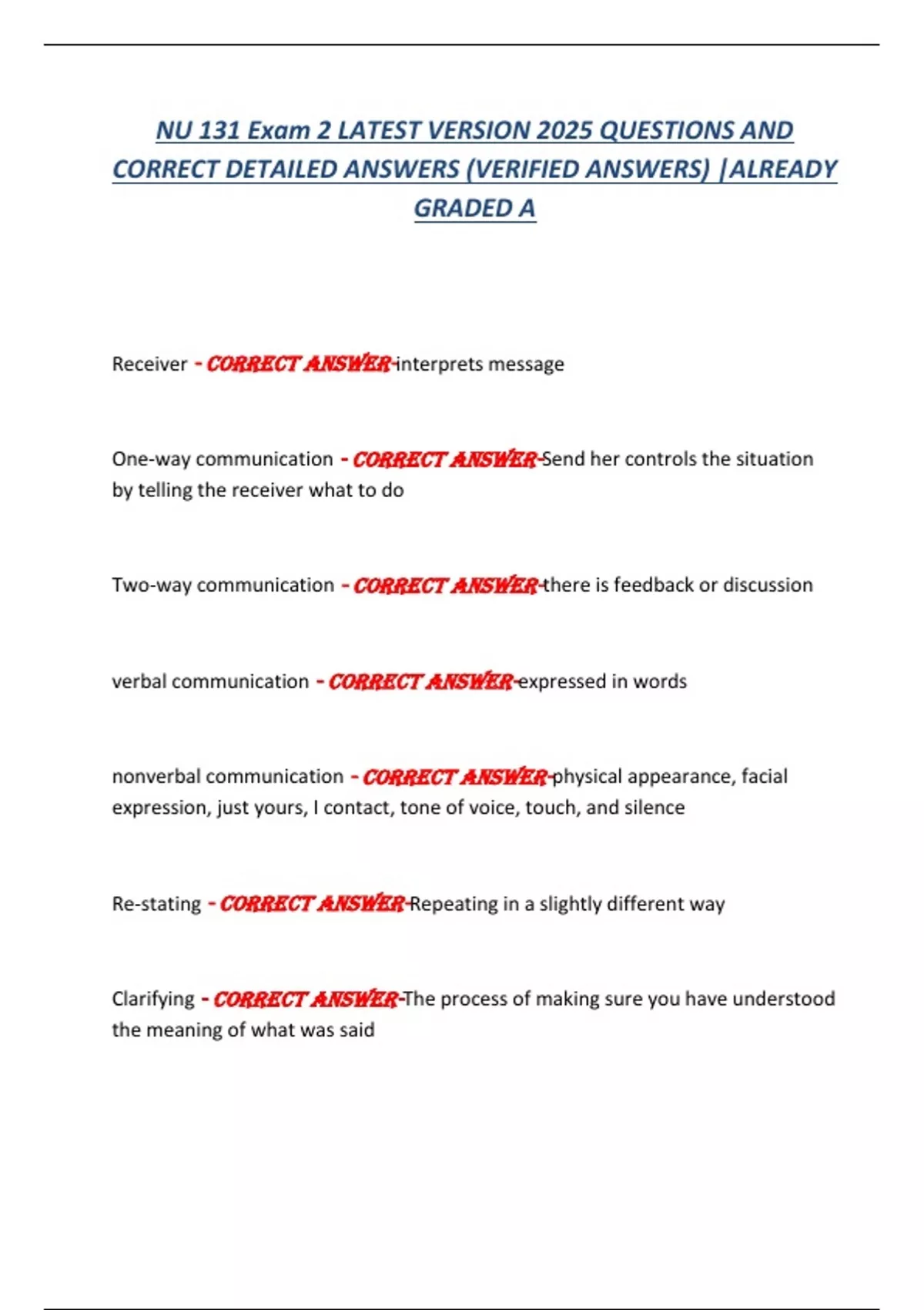 NU 131 Exam 2 LATEST VERSION 2025 QUESTIONS AND CORRECT DETAILED ANSWERS (VERIFIED ANSWERS) |ALREADY GRADED A