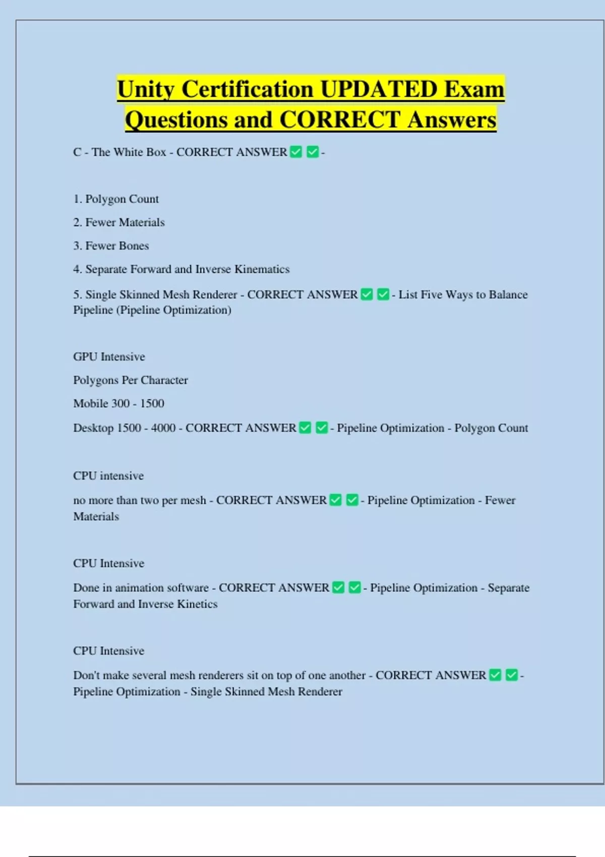 Unity Certification UPDATED Exam Questions and CORRECT Answers C - The White Box - CORRECT ANSWER 1. Polygon Count 2. Fewer Materials 3. Fewer Bones 4. Separate Forward and Inverse Kinematics - 5. Single Skinned Mesh Renderer - CORRECT ANSWER Pipeline (Pipeline Optimization) GPU Intensive Polygons Per Character Mobile 300 - 1500 Desktop - CORRECT ANSWER - List Five Ways to Balance