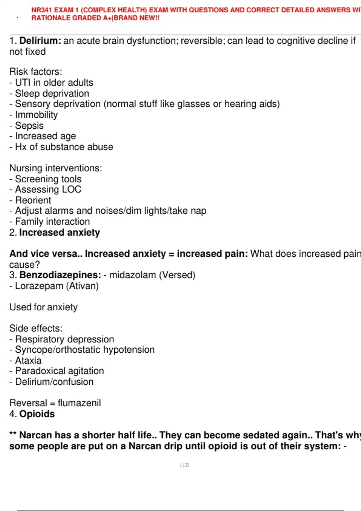 1. Delirium: an acute brain dysfunction; reversible; can lead to cognitive decline if