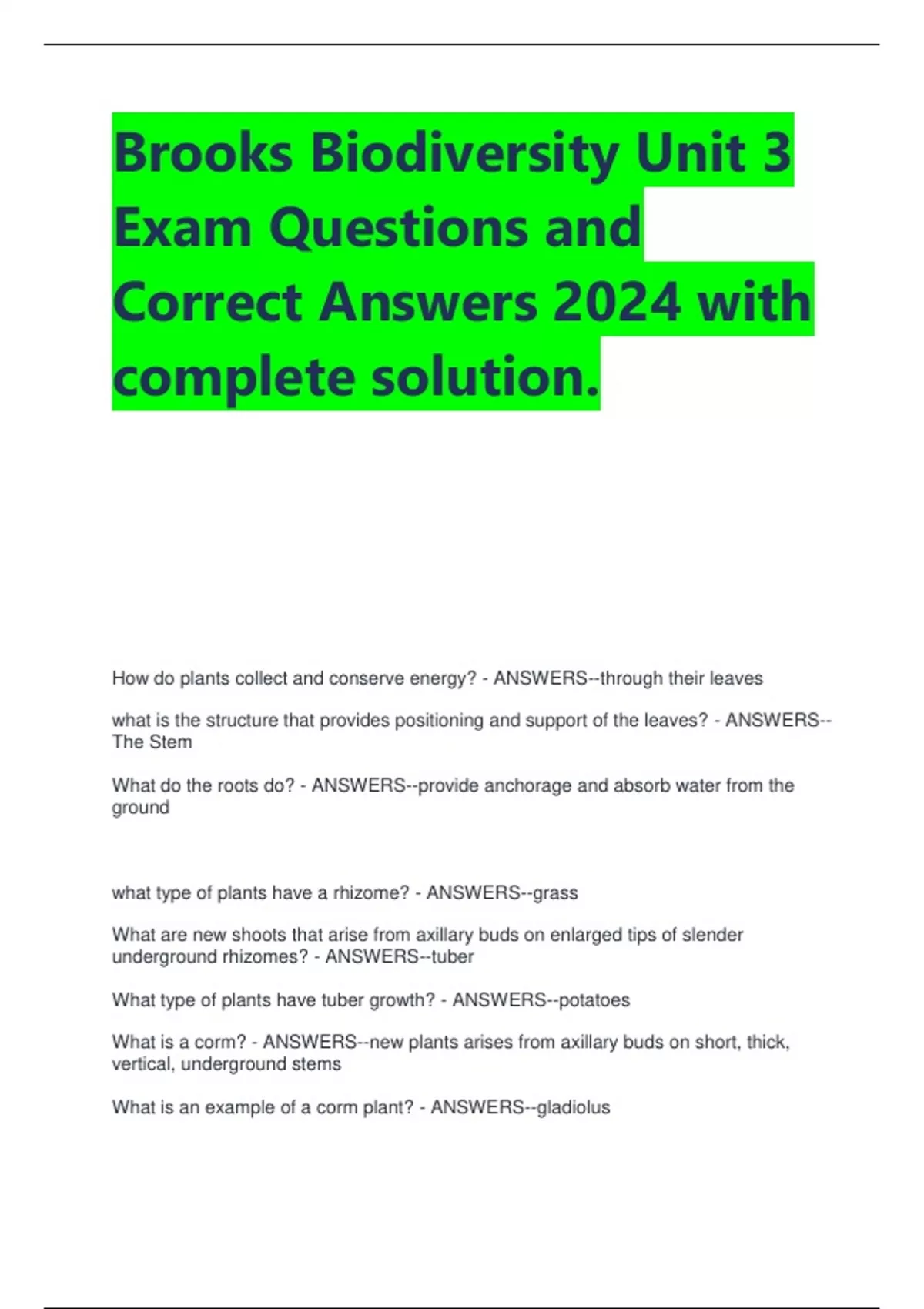 Brooks Biodiversity Unit 3 Exam Questions and Correct Answers 2024 with complete solution. How do plants collect and conserve energy? - ANSWERS--through their leaves what is the structure that provides positioning and support of the leaves? - ANSWERS-- The Stem What do the roots do? - ANSWERS--provide anchorage and absorb water from the ground what type of plants have a rhizome? - ANSWERS--grass What are new shoots that arise from axillary buds on enlarged tips of slender underground rhizomes? - ANSWERS--tuber