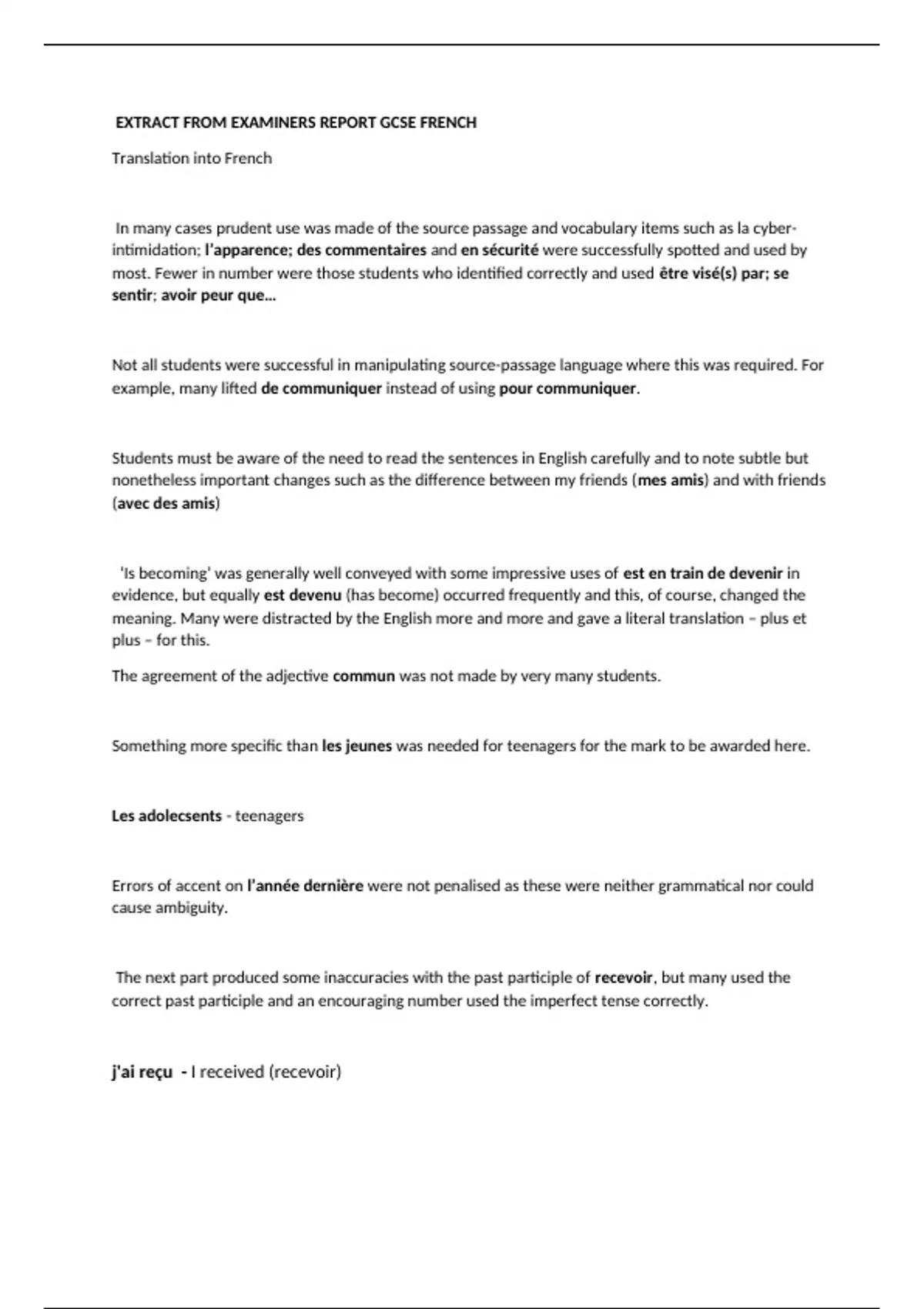 EXTRACT FROM EXAMINERS REPORT GCSE FRENCH