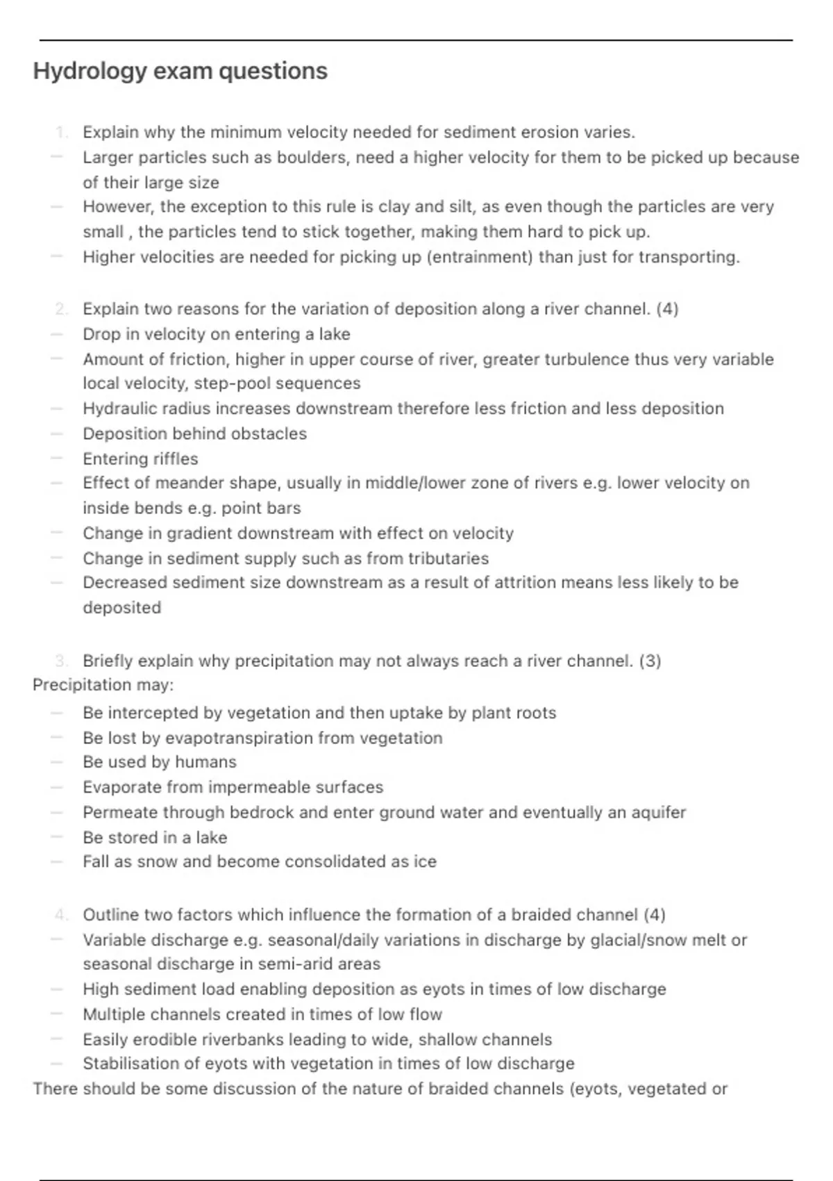 Summary CIE AS Level Geography - Hydrology (EXAM QUESTIONS)