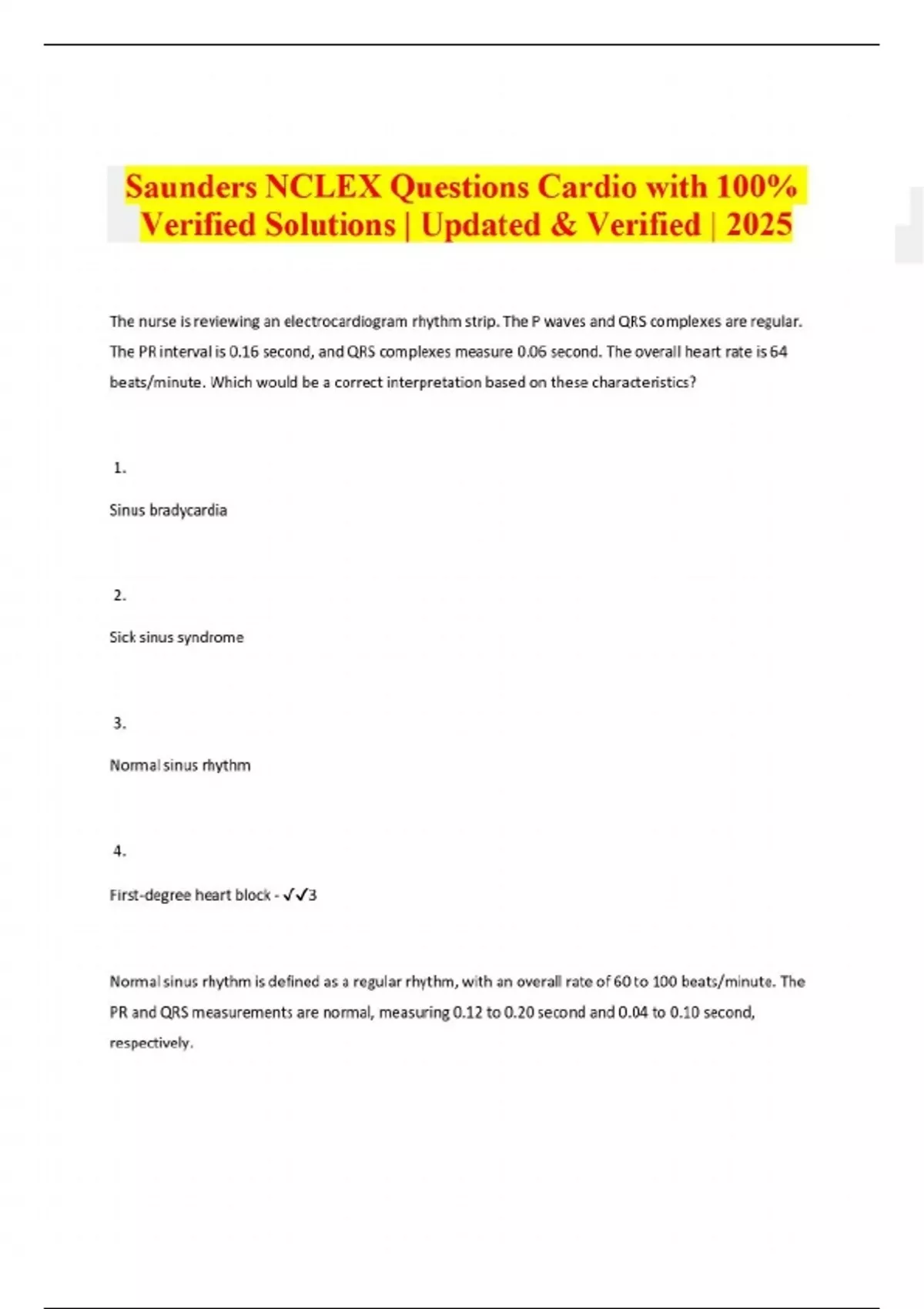 Saunders NCLEX Questions Cardio with 100% Verified Solutions | Updated & Verified | 2025 The nurse is reviewing an electrocardiogram rhythm strip. The P waves and QRS complexes are regular. The PR interval is 0.16 second, and QRS complexes measure 0.06 s