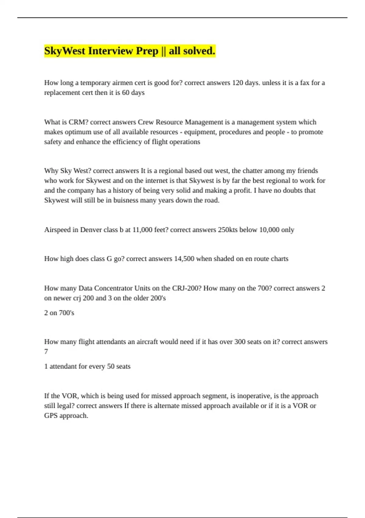 How long a temporary airmen cert is good for? correct answers 120 days. unless it is a fax for a replacement cert then it is 60 days What is CRM? correct answers Crew Resource Management is a management system which makes optimum use of all available resources - equipment, procedures and people - to promote safety and enhance the efficiency of flight operations Why Sky West? correct answers It is a regional based out west, the chatter among my friends who work for Skywest and on the internet is that Skywest is by far the best regional to work for and the company has a history of being very solid and making a profit. I have no doubts that Skywest will still be in buisness many years down the road. Airspeed in Denver class b at 11,000 feet? correct answers 250kts below 10,000 only How high does class G go? correct answers 14,500 when shaded on en route charts How many Data Concentrator Units on the CRJ-200? How many on the 700? correct answers 2 on newer crj 200 and 3 on the older 200's 2 on 700's How many flight attendants an aircraft would need if it has over 300 seats on it? correct answers 7 1 attendant for every 50 seats If the VOR, which is being used for missed approach segment, is inoperative, is the approach still legal? correct answers If there is alternate missed approach available or if it is a VOR or GPS approach.