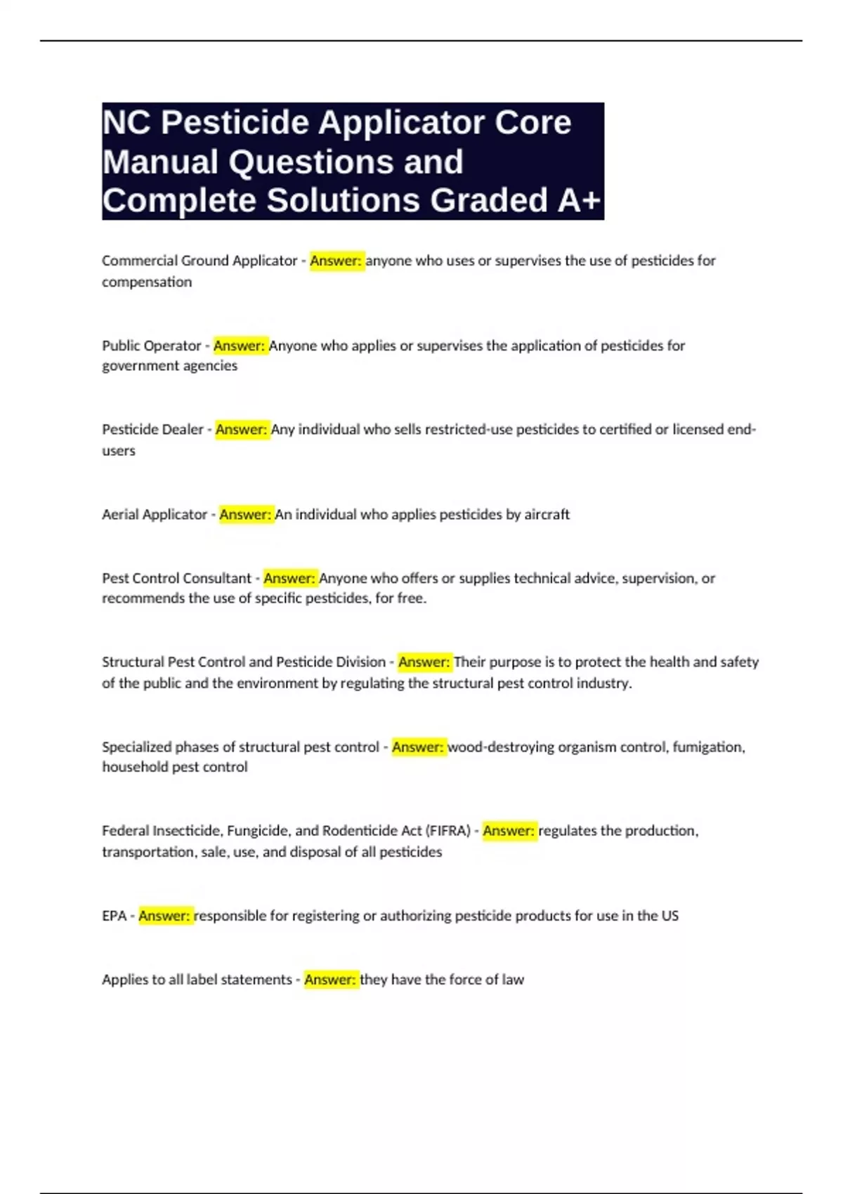 NC Pesticide Applicator Core Manual Questions and Complete Solutions Graded A+