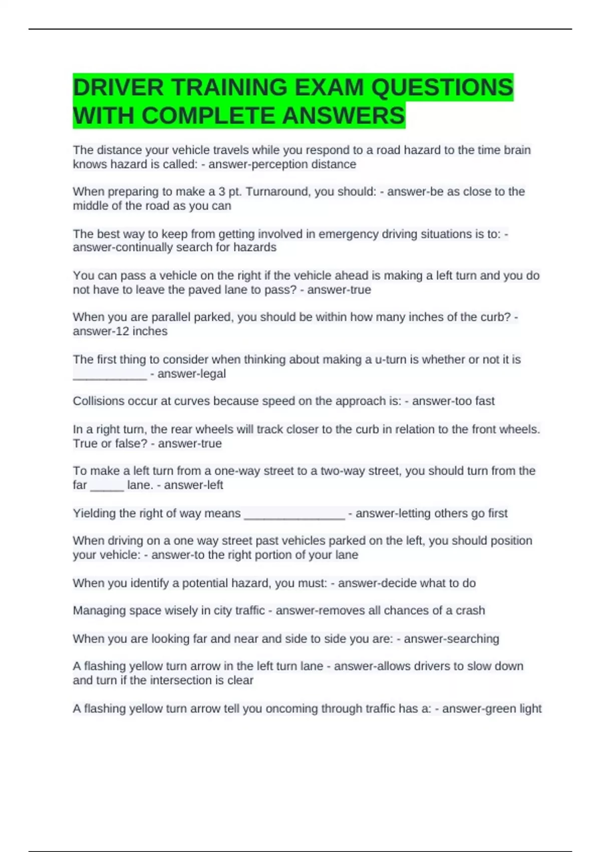 DRIVER TRAINING EXAM QUESTIONS WITH COMPLETE ANSWERS