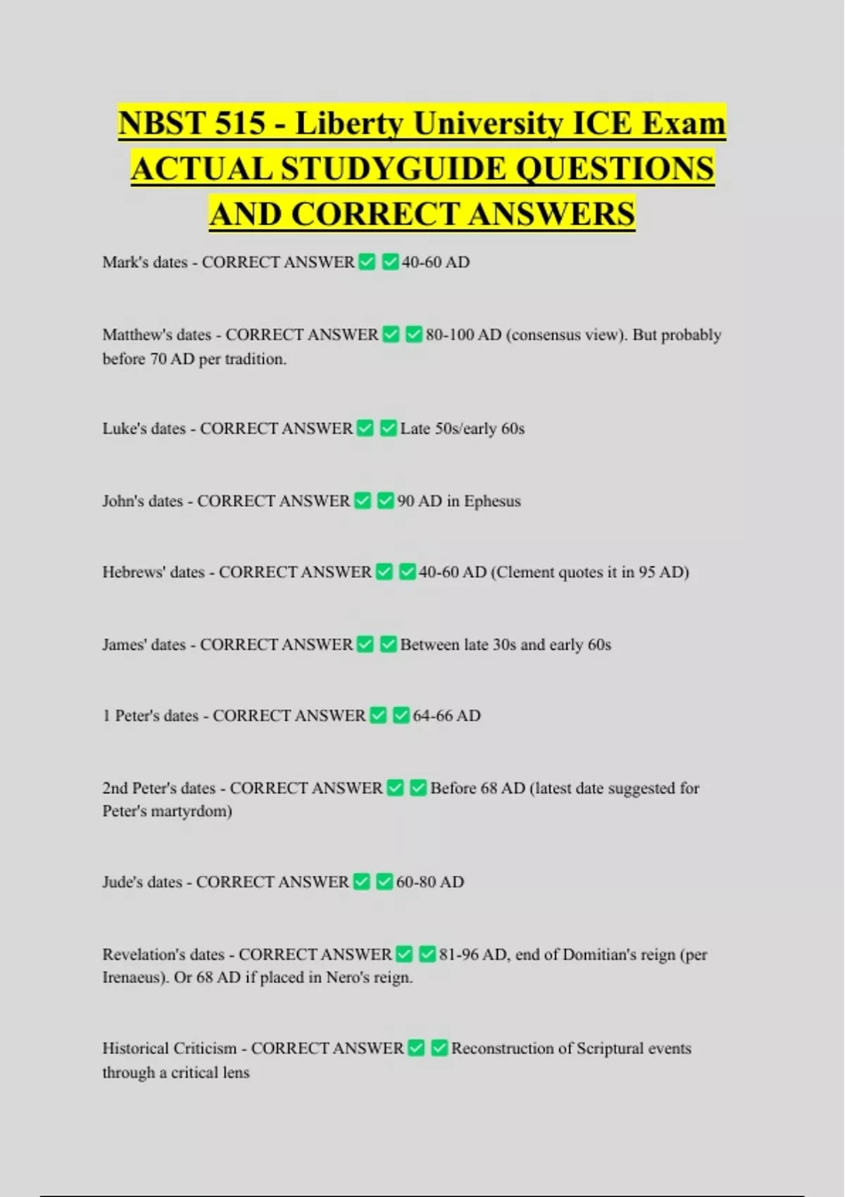 NBST 515 - Liberty University ICE Exam ACTUAL STUDYGUIDE QUESTIONS AND CORRECT ANSWERS Mark's dates - CORRECT ANSWER Matthew's dates - CORRECT ANSWER before 70 AD per tradition. Luke's dates - CORRECT ANSWER John's dates - CORRECT ANSWER Hebrews' dates - CORRECT ANSWER James' dates - CORRECT ANSWER 1 Peter's dates - CORRECT ANSWER 2nd Peter's dates - CORRECT ANSWER Peter's martyrdom) Jude's dates - CORRECT ANSWER Revelation's dates - CORRECT ANSWER 40-60 AD 80-100 AD (consensus view). But probably Late 50s/early 60s