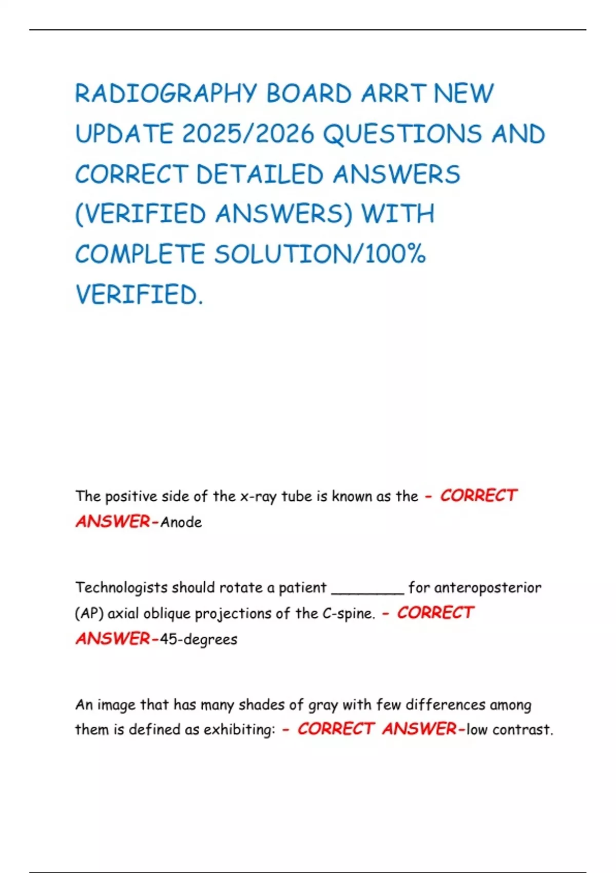 RADIOGRAPHY BOARD ARRT NEW UPDATE 2025/2026 QUESTIONS AND CORRECT DETAILED ANSWERS (VERIFIED ANSWERS) WITH COMPLETE SOLUTION/100% VERIFIED.