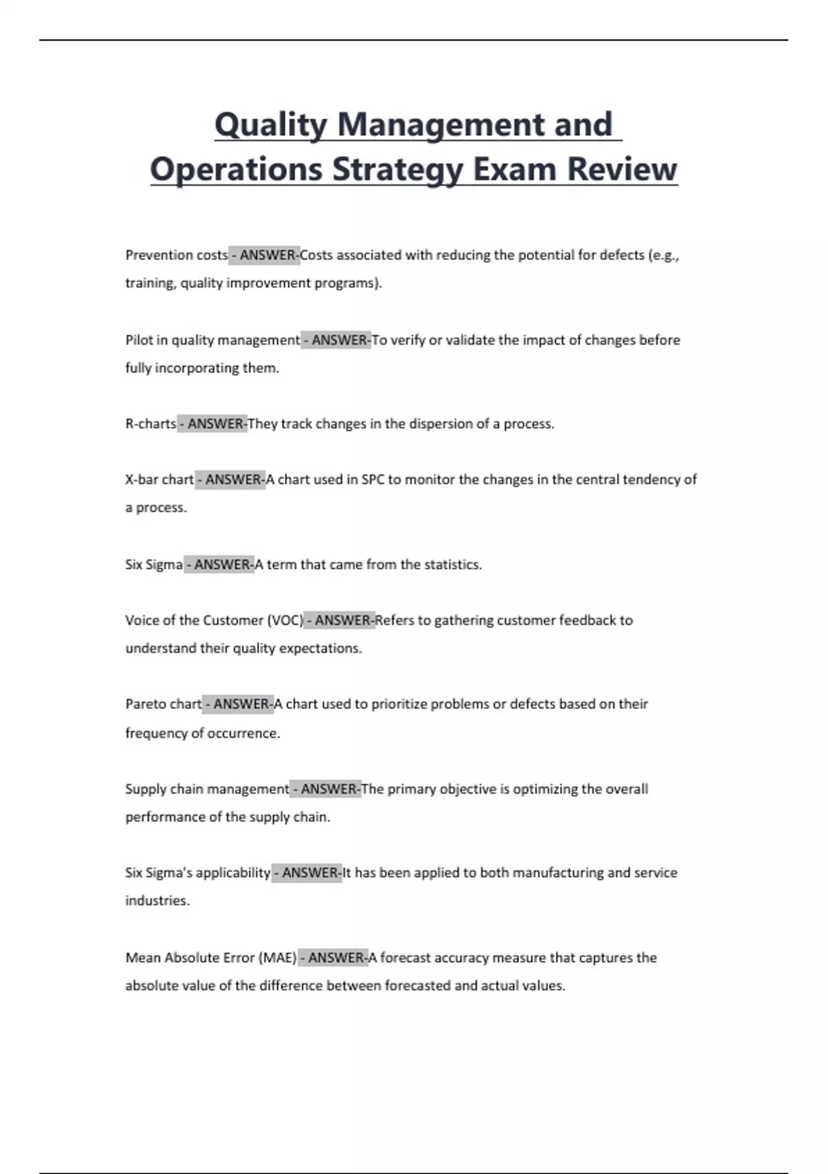 Quality Management and Operations Strategy Exam