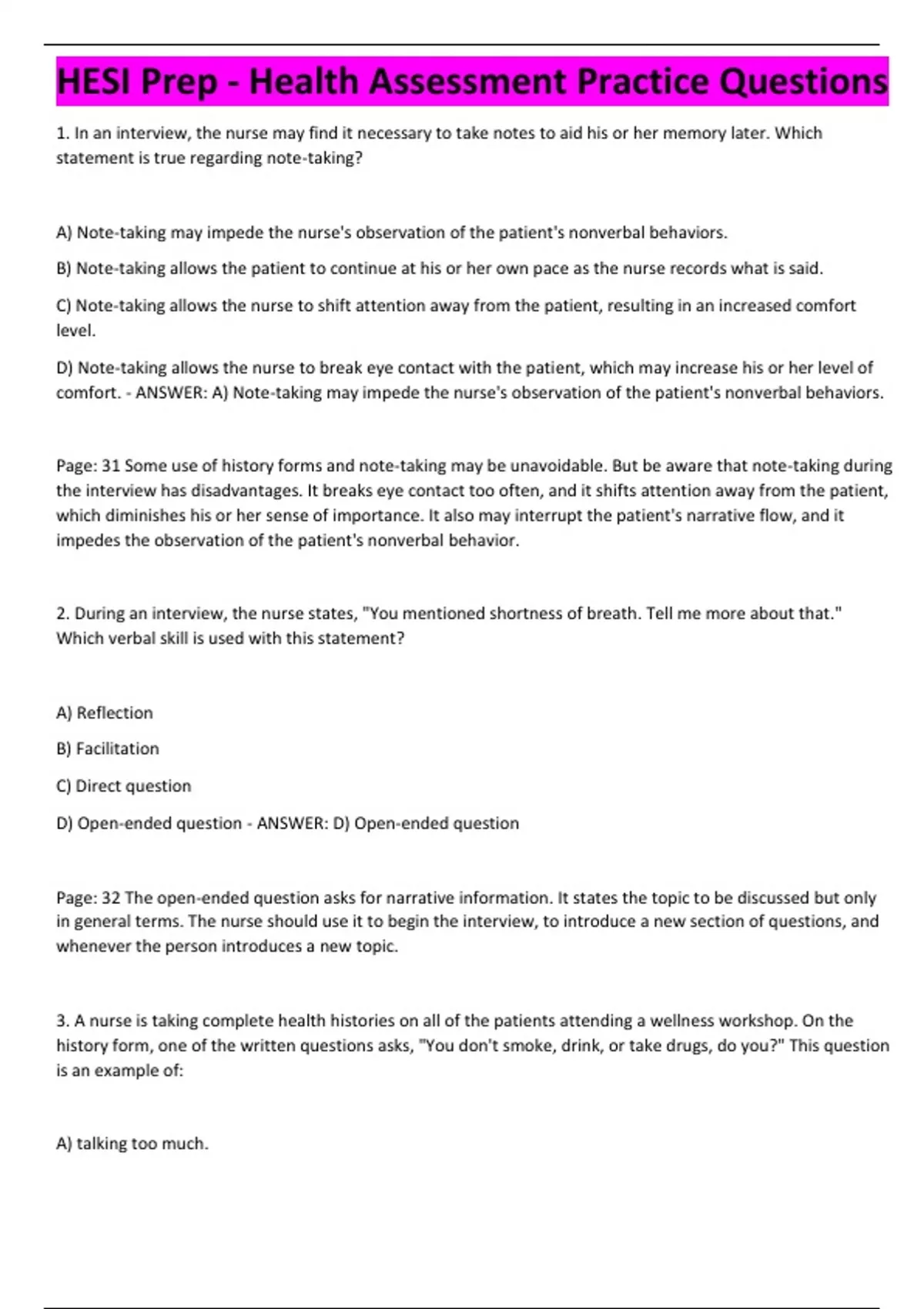 HESI Prep - Health Assessment Practice Questions