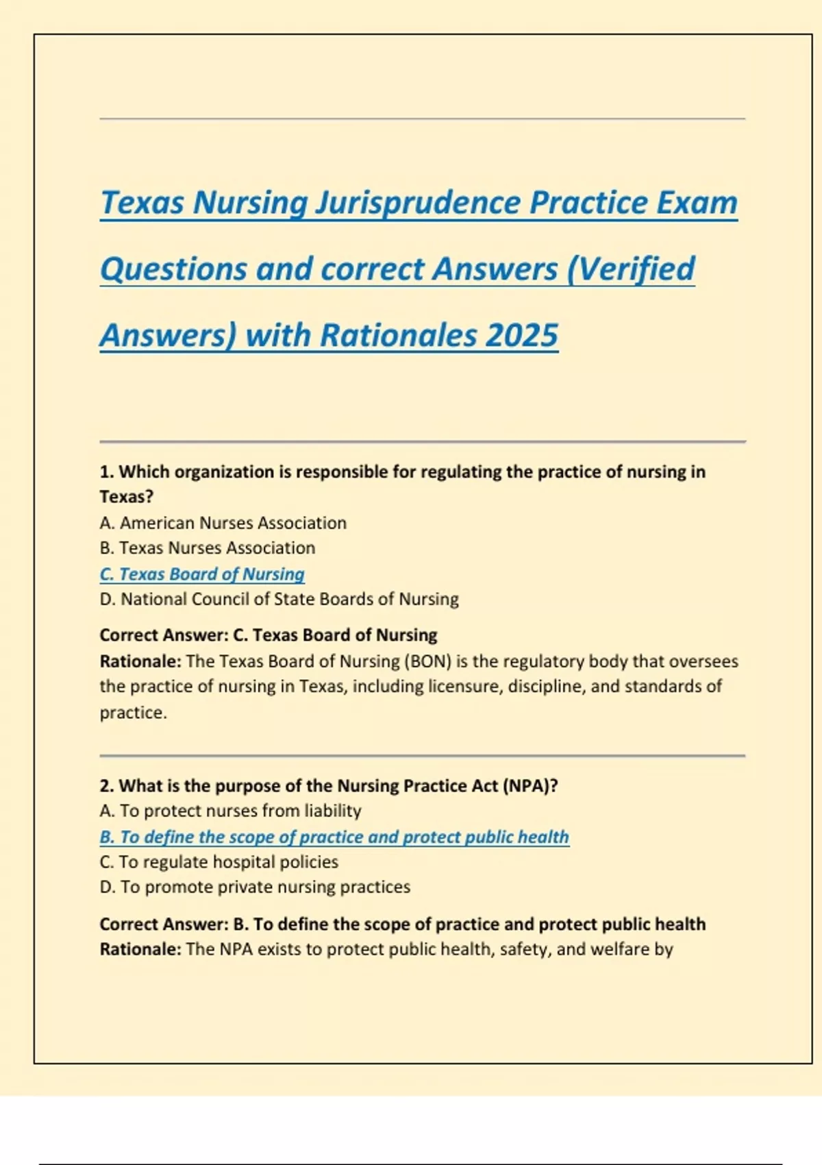 Texas Nursing Jurisprudence Practice Exam Questions and correct Answers (Verified Answers) with Rationales 2025