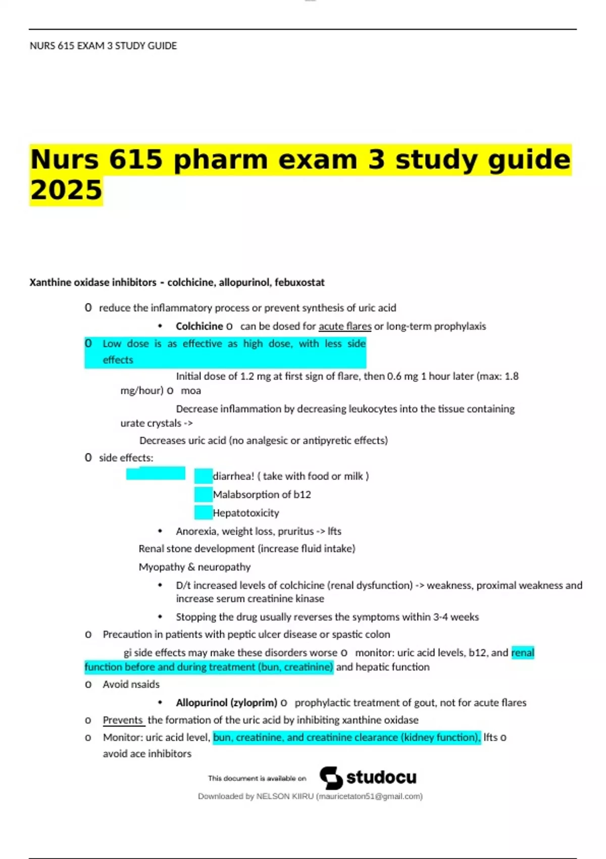 Nurs 615 pharm exam 3 study guide 2025 Xanthine oxidase inhibitors - colchicine, allopurinol, febuxostat O reduce the inflammatory process or prevent synthesis of uric acid • Colchicine o can be dosed for acute flares or long-term prophylaxis O Low dose is as effective as high dose, with less side effects  Initial dose of 1.2 mg at first sign of flare, then 0.6 mg 1 hour later (max: 1.8 mg/hour) o moa  Decrease inflammation by decreasing leukocytes into the tissue containing urate crystals -> Decreases uric acid (no analgesic or antipyretic