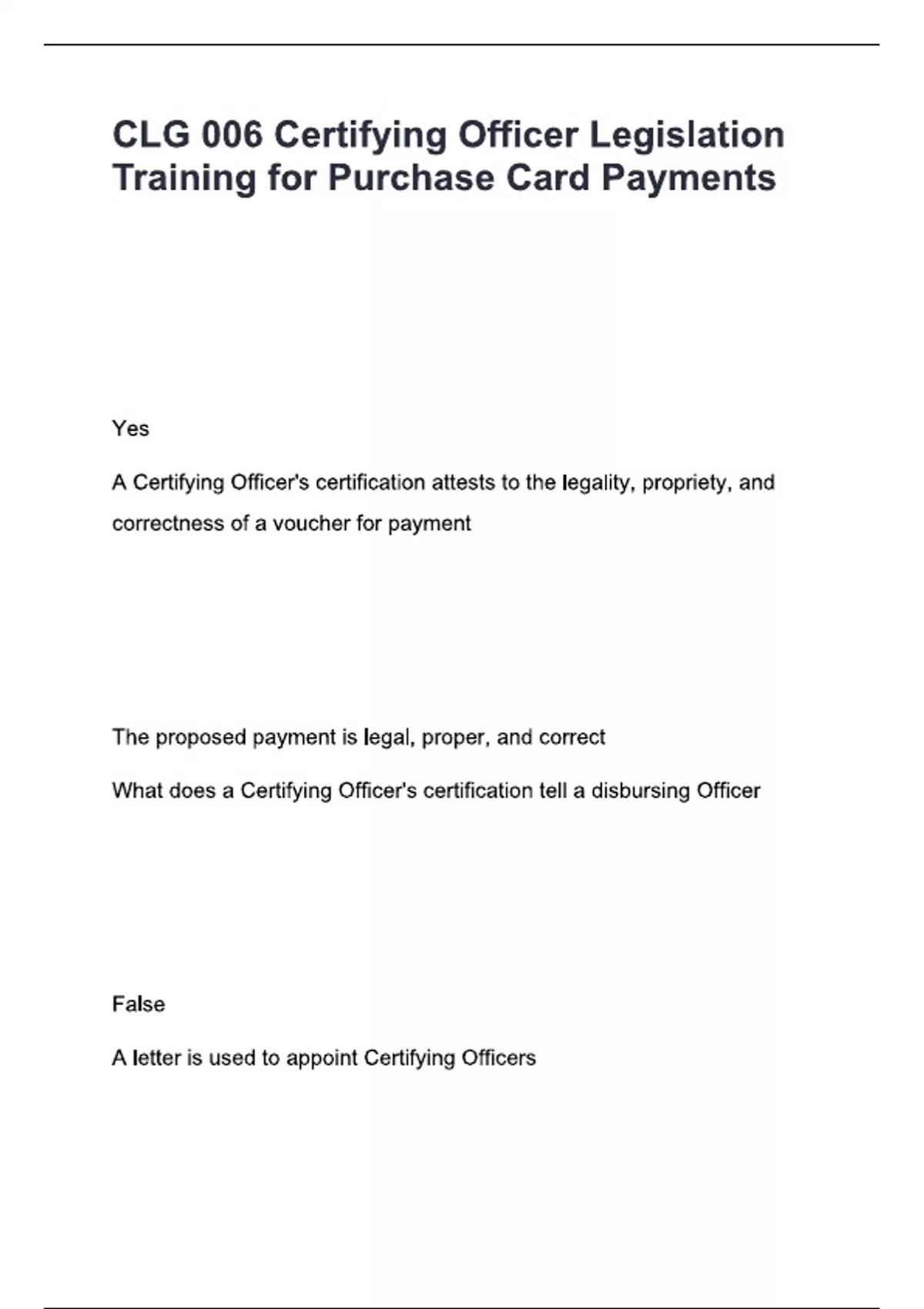 CLG 006 Certifying Officer Legislation Training for Purchase Card Payments Yes A Certifying Officer's certification attests to the legality, propriety, and correctness of a voucher for payment The proposed payment is legal, proper, and correct What does a Certifying Officer's certification tell a disbursing Officer False A letter is used to appoint Certifying Officers Automatic Certifying Officers have what type of pecuniary liability when dealing with e