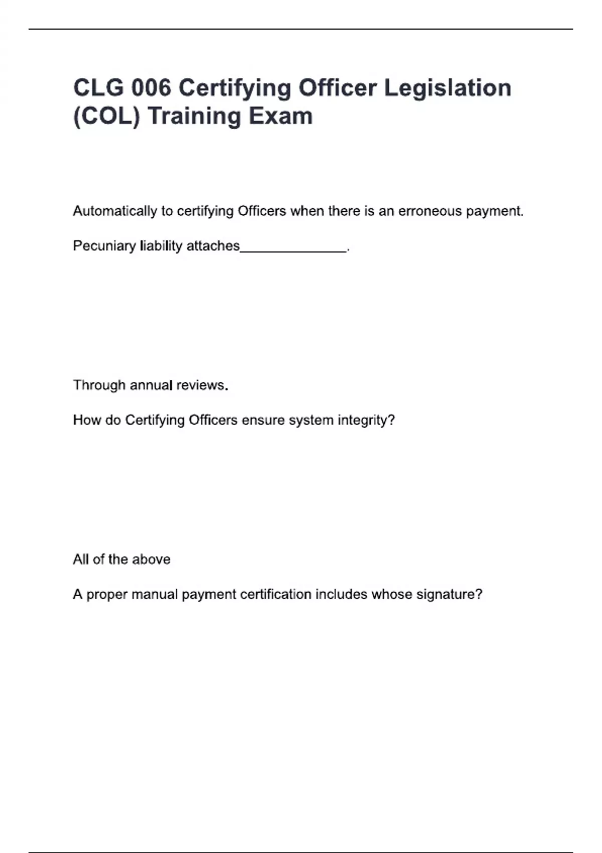 CLG 006 Certifying Officer Legislation (COL) Training Exam Questions & Answers Grade A+.