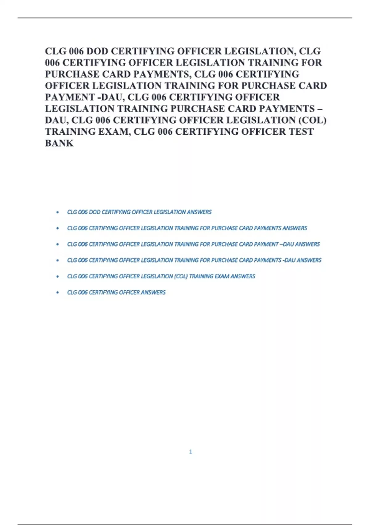 CLG 006 DOD CERTIFYING OFFICER LEGISLATION, CLG 006 CERTIFYING OFFICER LEGISLATION TRAINING FOR PURCHASE CARD PAYMENTS, CLG 006 CERTIFYING OFFICER LEGISLATION TRAINING FOR PURCHASE CARD PAYMENT -DAU, CLG 006 CERTIFYING OFFICER LEGISLATION TRAINING PURCHASE CARD PAYMENTS – DAU, CLG 006 CERTIFYING OFFICER LEGISLATION (COL) TRAINING EXAM, CLG 006 CERTIFYING OFFICER TEST BANK CLG 006 DOD CERTIFYING OFFICER LEGISLATION ANSWERS CLG 006 CERTIFYING OFFICER LEGISLATION TRAINING FOR PURCHASE CARD PAYMENTS ANSWERS CLG 006 CERTIFYING OFFICER LEGISLATION TRAINING FOR PURCHASE CARD PAYMENT –DAU ANSWERS CLG 006 CERTIFYING OFFICER LEGISLATION TRAINING FOR PURCHASE CARD PAYMENTS -DAU ANSWERS CLG 006 CERTIFYING OFFICER LEGISLATION (COL) TRAINING EXAM ANSWERS CLG 006 CERTIFYING OFFICER ANSWERS