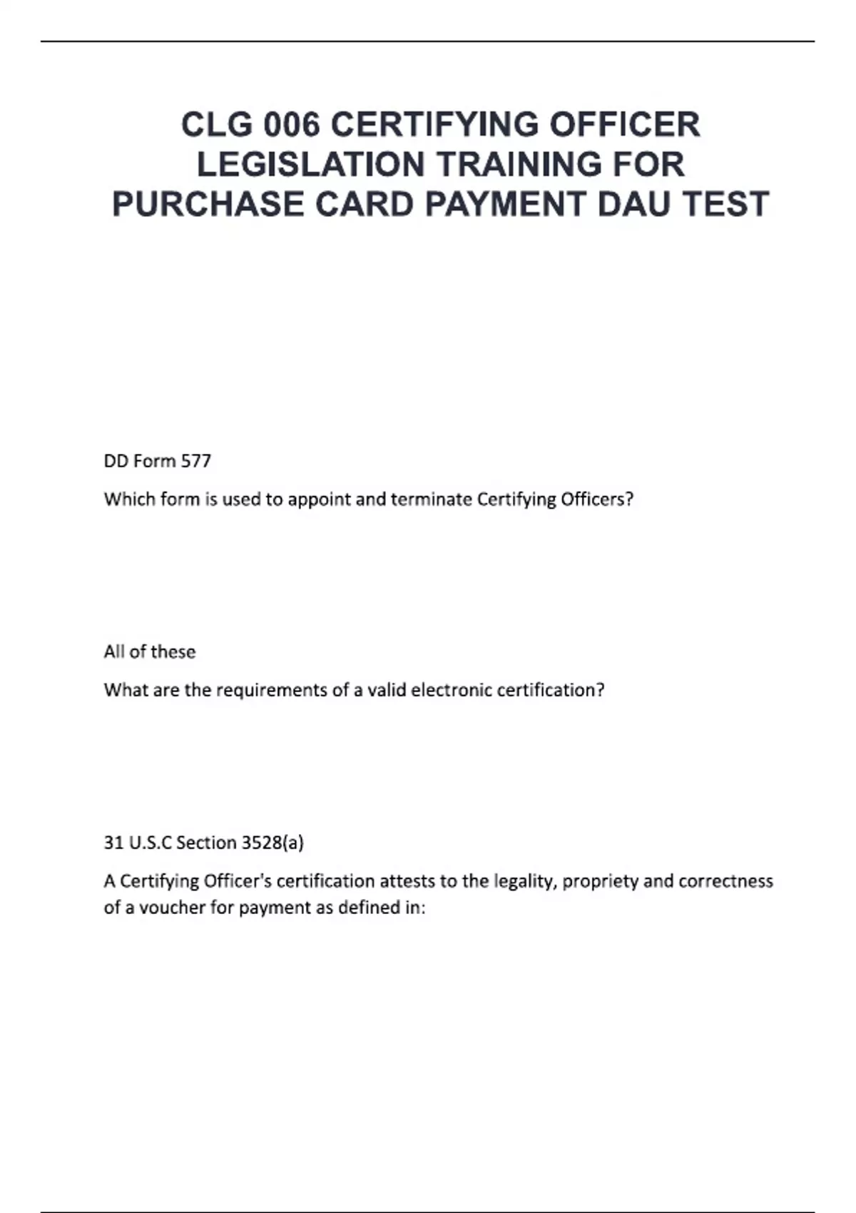 CLG 006 CERTIFYING OFFICER LEGISLATION TRAINING FOR PURCHASE CARD PAYMENT DAU TEST.pdf DD Form 577 Which form is used to appoint and terminate Certifying Officers? All of these What are the requirements of a valid electronic certification? 31 U.S.C Section 3528(a) A Certifying Officer's certification attests to the legality, propriety and correctness of a voucher for payment as defined in: Supporting the Certifying Officers with Timely and accurate data, information and/or service to ensure proper payments What are Departmental Accountable Officials responsible for General Counsel From whom does the Certifying Off