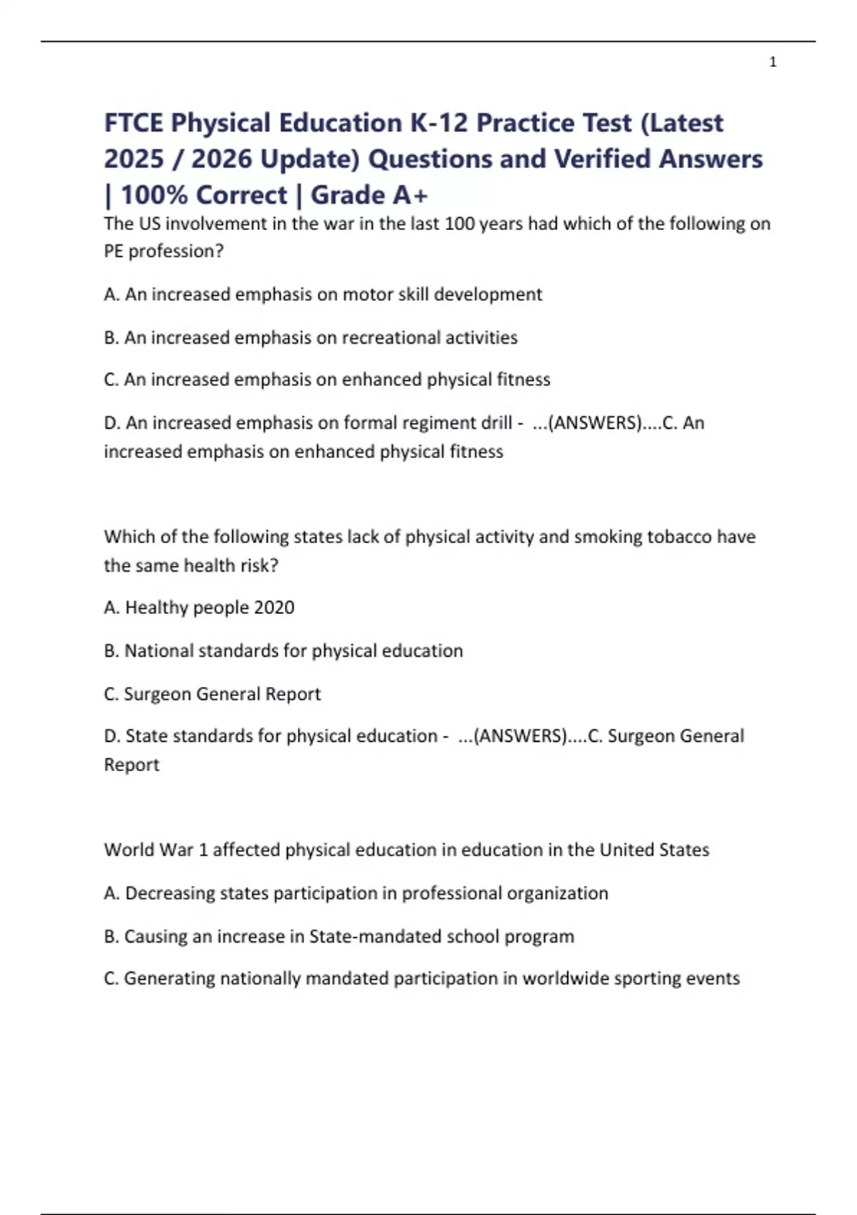FTCE Physical Education K-12 Practice Test (Latest 2025 / 2026 Update) Questions and Verified Answers | 100% Correct | Grade A+