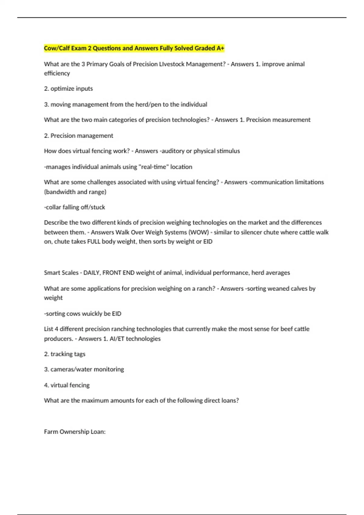 Cow/Calf Exam 2 Questions and Answers Fully Solved Graded A+ What are the 3 Primary Goals of Precision LIvestock Management? - Answers 1. improve animal efficiency 2. optimize inputs 3. moving management from the herd/pen to the individual What are the two main categories of precision technologies? - Answers 1. Precision measurement 2. Precision management How does virtual fencing work? - Answers -auditory or physical stimulus -manages individual animals using "real-time" location What are some challenges associated with using virtual fencing? - Answers -communication limitations (bandwidth and range) -collar falling off/stuck Describe the two different kinds of precision weighing technologies on the market and the differences between them. - Answers Walk Over Weigh Systems (WOW) - similar to silencer chute where cattle walk on, chute takes FULL body weight, then sorts by weight or EID Smart Scales - DAILY, FRONT END weight of animal, individual performance, herd averages What are some applications for precision weighing on a ranch? - Answers -sorting weaned calves by weight -sorting cows wuickly be EID List 4 different precision ranching technologies that currently make the most sense for beef cattle producers. - Answers 1. AI/ET technologies 2. tracking tags 3. cameras/water monitoring 4. virtual fencing What are the maximum amounts for each of the following direct loans? Farm Ownership Loan: Microloan: Operating Loan: Youth Loan: Emergency Loan: - Answers Farm Ownership Loan: $600,000 (purchase land/new buildings) 5.5% interest Microloan: $50,000 (non-traditional operations) 5.0% interest Operating Loan: $400,000 (equipment, labor, etc.) 5.25% interest