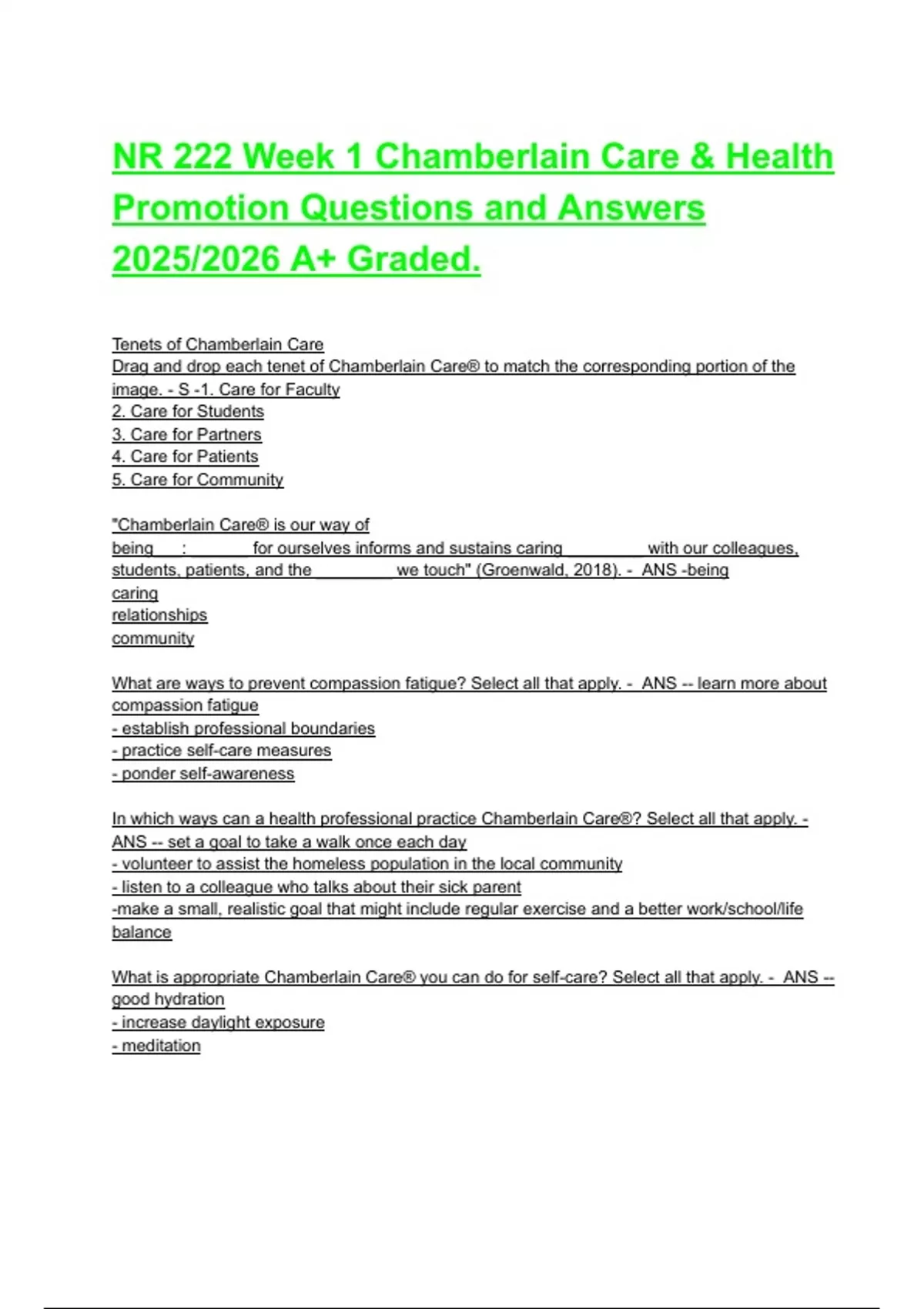 NR 222 Week 1 Chamberlain Care & Health Promotion Questions and Answers 2025/2026 A+ Graded. What are ways to prevent compassion fatigue? Select all that apply. - ANS -- learn more about compassion fatigue - estWhat are ways to prevent compassion fatigue? Select all that apply. - ANS -- learn more about compassion fatigue - establish professional boundaries - practice self-care measures ablish professional boundaries - practice self-care measures
