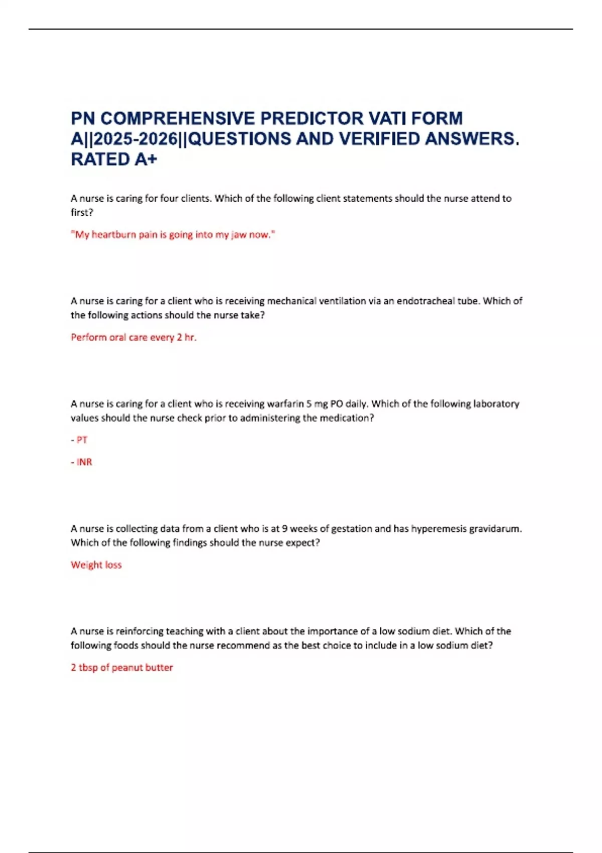 PN COMPREHENSIVE PREDICTOR VATI FORM A||||QUESTIONS AND VERIFIED ANSWERS. RATED A+