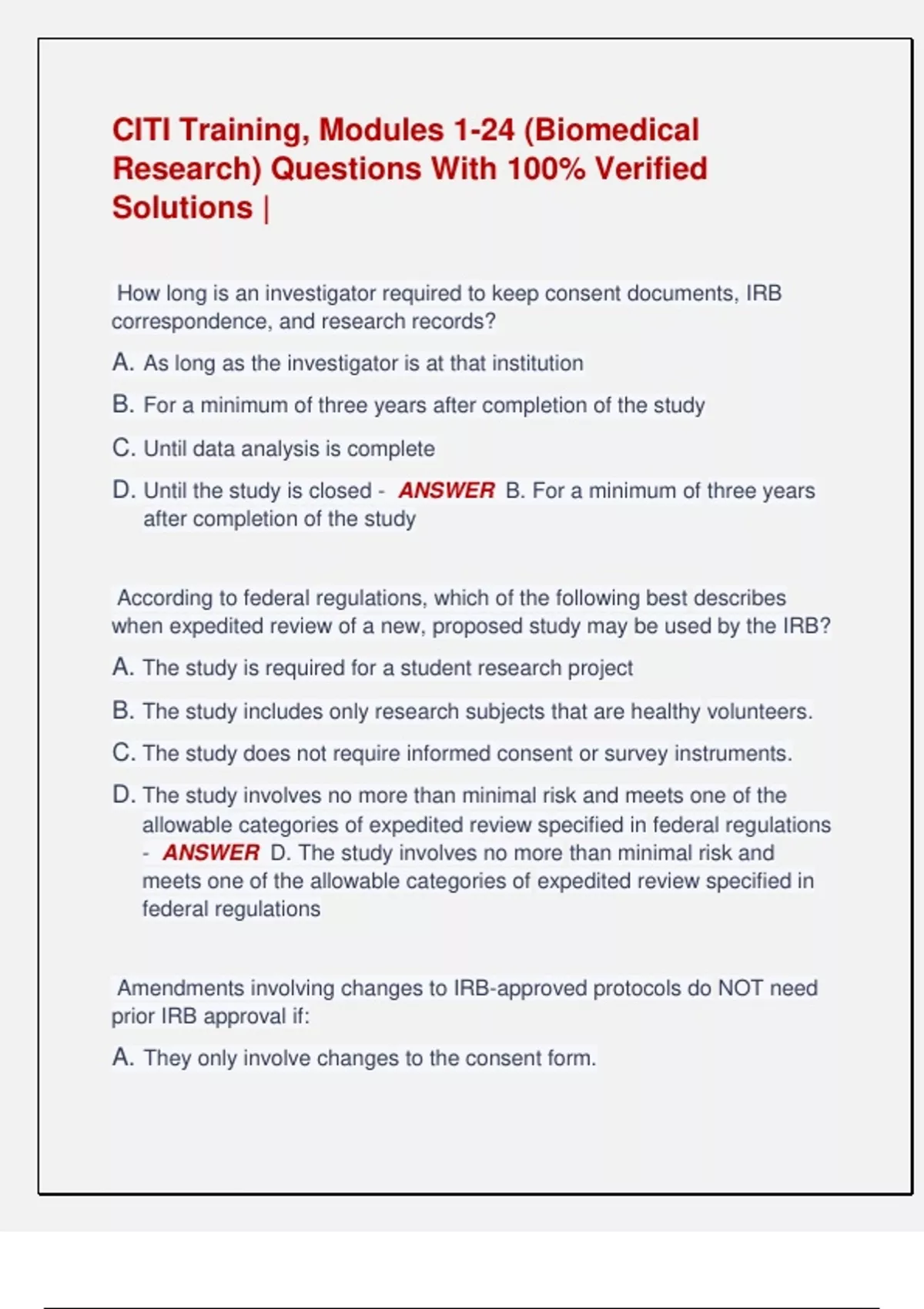 CITI Training, Modules 1-24 (Biomedical Research) Questions With 100% Verified Solutions | How long is an investigator required to keep consent documents, IRB correspondence, and research records? A. As long as the investigator is at that institution B. For a minimum of three years after completion of the study C. Until data analysis is complete D. Until the study is closed - ANSWER B. For a minimum of three years after completion of the study According to federal regulations, which of the following best describes when expedited review of a new, proposed study may be used by the IRB? A. The study is required for a student research project B. The study includes only research subjects that are healthy volunteers. C. The study does not require informed consent or survey instruments. D. The study involves no more than minimal risk and meets one of the allowable categories of expedited review specified in federal regulations - ANSWER D. The study involves no more than minimal risk and meets one of the allowable categories of expedited review specified in federal regulations Amendments involving changes to IRB-approved protocols do NOT need prior IRB approval if: A. They only involve changes to the consent form. B. The changes must be immediately implemented for the health and well being of the subject. C. They are eligible for review using expedited procedures. D. The investigator keeps careful records of all changes and includes them in the final report. - ANSWER B. The changes must be immediately implemented for the health and well-being of the subject. IRB continuing review of a greater than minimal risk approved protocol that is currently enrolling subjects must: A. Include copies of all signed consent forms. B. Occur at least annually. C. Be conducted by an expedited review. D. Occur only when the level of risk changes. - ANSWER B. Occur at least annually. A general requirement for the informed consent form is that it may not include any exculpatory language. Exculpatory language is that which waives or appears to waive any of the subject's legal rights or releases or appears to release those conducting the research from liability for negligence. Which of the following statements in a consent form is an example of exculpatory language? A. In the event of any injury you may have related to this research, you will be given medical treatment. B. Your participation in this research is voluntary. If you choose not to participate, or change your mind later, your decision will not affect your relationship with your doctor or your right to health care or other services that you may be eligible for. C. The investigator may stop you from participating in this research without your consent if you experience side effects that make your condition worse. If you become ill during the research, you may have to drop out. D. I waive any possibility of compensation for injuries that I may receive as a result of participation in this research. - ANSWER D. I waive any possibility of compensation for injuries that I may receive as a result of participation in this research. An investigator is confronted with a life-threatening situation that necessitates using a test article in a human subject who is unable to provide informed consent and there is no time to obtain consent from the individual's LAR and no alternative method or recognized therapy is available. Under the FDA regulations for using test articles, which of the following describes the best course of action for the investigator: A. Submit a research protocol to the IRB and justify an expedited review approval of the consent document so test article can be used immediately. B. Use the test article without obtaining consent from the subject or the LAR then notify the IRB. C. The investigator and an independent physician agree that the situation necessitates the use of the test article. An exception or waiver for informed consent can be made under these circumstances. The IRB will be notified later. D. Do not use the test article until either the subject or the subject's LAR can give consent. - ANSWER C. The investigator and an independent physician agree that the situation necessitates the use of the test article. An exception or waiver for informed consent can be made under these circumstances. The IRB will be notified later. An elderly gentleman, whose wife is his legally authorized representative (LAR) since his strokes several years ago, was recently diagnosed with lung cancer. He is eligible for a clinical trial using a new investigational drug that aims to treat lung cancer. He is able to express interest, shows a basic