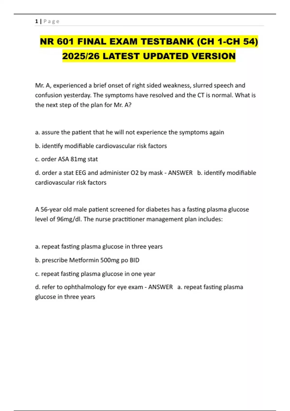 NR 601 FINAL EXAM TESTBANK (CH 1-CH 54) 2025/26 LATEST UPDATED VERSION